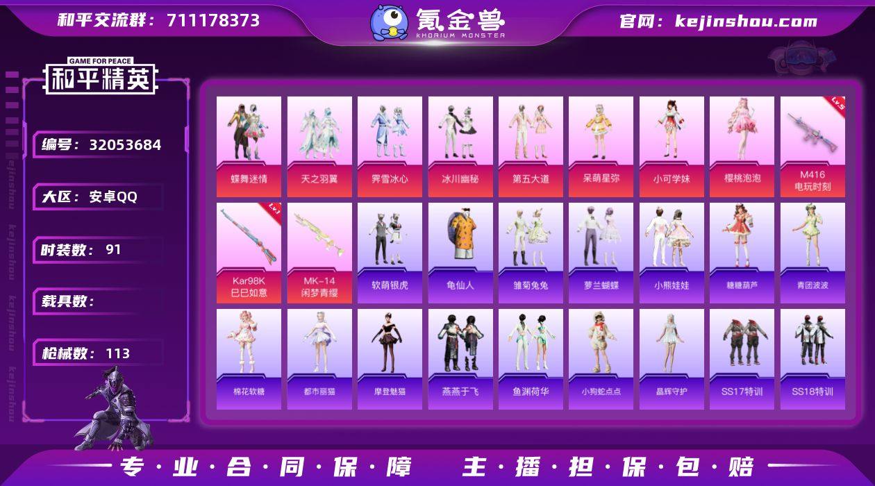 安卓 手Q-8粉装-3特效枪-0载具-1粉色飞行器-35238热力值-7王牌印记-91套装-113枪皮 【热门品类】:套装-龟仙人 【粉色套装】:粉装-蝶舞迷情,粉装-天之羽翼,粉装-霁雪冰心,粉装-冰川幽秘,粉装-第五大道,角色-呆萌星弥,角色-小可学妹,角色-樱桃泡泡 【粉色枪皮等级】:M416-电玩时刻(五级),Kar98K-巳巳如意(一级) 【粉色枪皮】:M416-电玩时刻,Kar98K-巳巳如意,Mk14-闲梦青缨 【粉色飞行器】:相思残雪飞行器 【粉色降落伞】:春暖花开降落伞,相思残雪降落伞,暗夜玫瑰降落伞,旋转彩虹降落伞,莲影清波降落伞,蜜语绒猫降落伞,千金淑猫降落伞,月下星之子降落伞 【稀有套装】:套装-龟仙人,套装-雏菊兔兔,套装-萝兰蝴蝶,套装-小熊娃娃,套装-糖糖葫芦,套装-青团波波,套装-棉花软糖,角色-都市丽猫,角色-摩登魅猫,套装-燕燕于飞,套装-鱼渊荷华,玩偶服-小狗蛇点点,套装-晶辉守护 【稀有枪皮】:AKM-灼热熔岩,AKM-龙的传人,M16A4-幻世战舞者,M16A4-千金淑猫,SCAR-L-玉兔迎春,SCAR-L-红色方程式,M416-糯团青竹,M416-蓝色火焰,GROZA-春暖花开,GROZA-紫翼圣骑,AUG-耀粉歌者,QBZ-未来歌姬,QBZ-飞驰魅影,M762-奇异狩猎者,M762-彩虹甜喵,G36C-暗夜玫瑰,AC-VAL-快闪甜心,UZI-啾咪啾咪,UZI-炫彩节奏,UMP45-春暖花开,UMP45-炫光之旅,UMP45-生命誓言,Vector-焰鹰斗篷,Vector-暗夜玫瑰,汤姆逊-暗夜鎏金,汤姆逊-耀粉歌者,P90-快闪甜心,P90-飞驰魅影,Kar98K-彩虹符号,Kar98K-炫彩节奏,Kar98K-飞驰魅影,M24-仲夏莫吉托,AWM-焰鹰斗篷,AWM-圣堂之誓,SKS-天之羽翼,VSS-碧影闪光,Mini14-炫彩节奏,Mini14-耀粉歌者,Win94-晶梦幻蝶,MK20-H-快闪甜心,S686-生命誓言,S686-白勺歌姬,S686-千金淑猫,S1897-春暖花开,S1897-炫彩节奏,S1897-碧影闪光,S1897-飞驰魅影,S12K-...