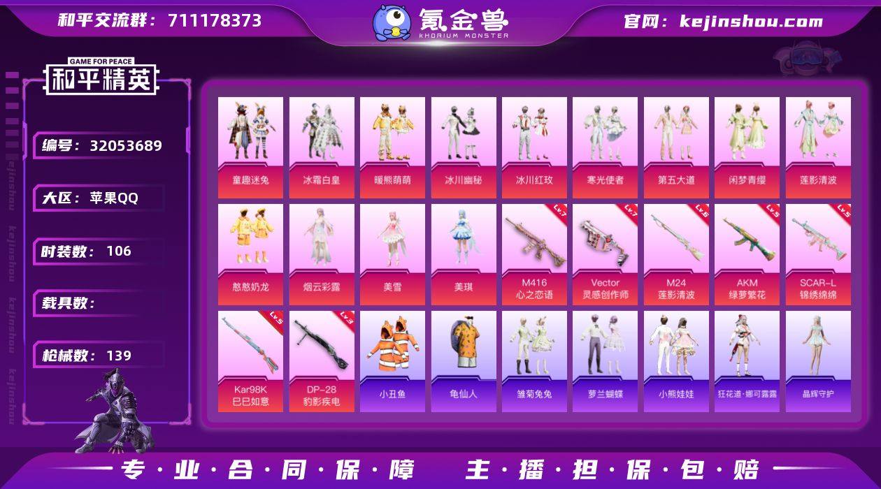 苹果 手Q-13粉装-7特效枪-0载具-2粉色飞行器-48984热力值-10王牌印记-106套装-139枪皮 【热门品类】:粉装-童趣迷兔,套装-小丑鱼,套装-龟仙人 【粉色套装】:粉装-冰霜白皇,粉装-童趣迷兔,粉装-暖熊萌萌,粉装-冰川幽秘,粉装-冰川红玫,粉装-寒光使者,粉装-第五大道,粉装-闲梦青缨,粉装-莲影清波,粉装-憨憨奶龙,角色-烟云彩露,角色-美雪,角色-美琪 【粉色枪皮等级】:AKM-绿萝繁花(五级),SCAR-L-锦绣绵绵(五级),M416-心之恋语(七级),Vector-灵感创作师(七级),Kar98K-巳巳如意(五级),M24-莲影清波(六级),DP-28-豹影疾电(三级) 【粉色枪皮】:AKM-绿萝繁花,SCAR-L-锦绣绵绵,M416-心之恋语,Vector-灵感创作师,Kar98K-巳巳如意,M24-莲影清波,DP-28-豹影疾电 【粉色飞行器】:祥瑞锦鲤飞行器,镜域双华-灵镜之阶 【粉色降落伞】:童趣迷兔降落伞,千面幻镜降落伞,旋转彩虹降落伞,冰川粉黛降落伞,暗夜鎏金降落伞,超新星降落伞,莲影清波降落伞,圣堂之誓降落伞,蜜语绒猫降落伞,镜域双华降落伞,金丰海韵降落伞 【稀有套装】:套装-龟仙人,套装-雏菊兔兔,套装-萝兰蝴蝶,套装-小熊娃娃,角色-狂花道·娜可露露,套装-晶辉守护,角色-瑰梦爱神 【稀有枪皮】:AKM-彩虹符号,AKM-胡桃卫兵,AKM-龙的传人,M16A4-莲影清波,SCAR-L-暗夜玫瑰,SCAR-L-红色方程式,M416-糯团青竹,M416-绯红前夜,GROZA-懵萌河马,GROZA-田园牧歌,AUG-冰川粉黛,AUG-天降萌叽,AUG-怪笑疯兔,AUG-耀粉歌者,QBZ-未来歌姬,QBZ-洛神天依,QBZ-银碳小老虎,M762-天降萌叽,M762-暗夜鎏金,M762-第五大道,G36C-镜域双华,G36C-懵萌河马,AC-VAL-快闪甜心,蜜獾-天降萌叽,UZI-啾咪啾咪,UZI-天降萌叽,UMP45-涂山之恋,UMP45-生命誓言,UMP45-蓝色火焰,Vector-焰鹰斗篷,Vector-田园牧歌,Vector-创世·救赎,汤...