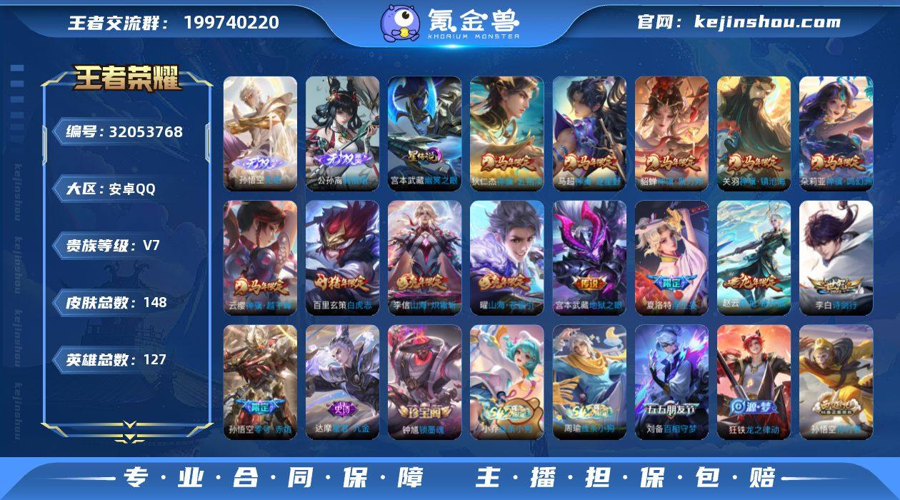 贵族等级:V7 典藏皮肤数:0 珍品无双皮肤数:0 无双皮肤数:2 珍品传说皮肤数:0 传说皮肤数:14 史诗皮肤数:45 皮肤数:148 英雄数:127 段位:无双王者 卖家说:全套马限,打野和对抗每个英雄都有好皮肤,关羽省标