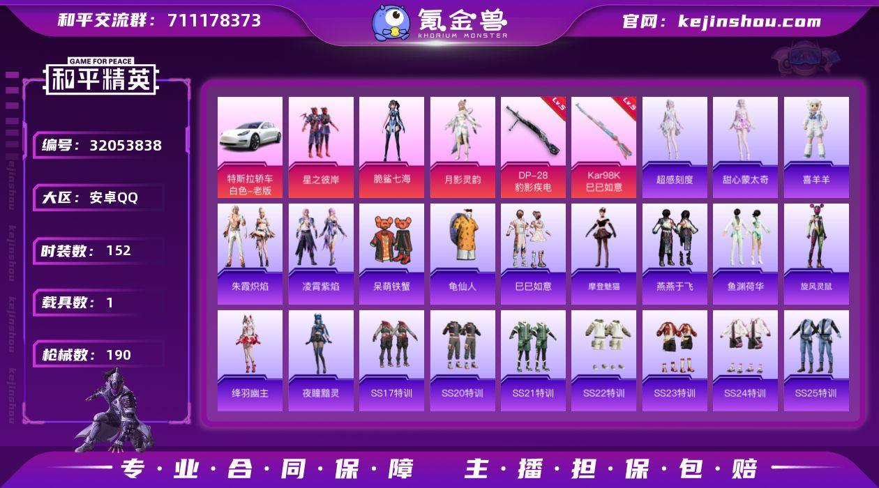 安卓 手Q-3粉装-4特效枪-1载具-2粉色飞行器-55758热力值-10王牌印记-152套装-190枪皮 【热门品类】:套装-龟仙人 【粉色套装】:粉装-星之彼岸,角色-脆鲨七海,角色-月影灵韵 【粉色枪皮等级】:UMP45-萌骑冒险(五级),Kar98K-巳巳如意(五级),Mk14-福马献瑞(五级),DP-28-豹影疾电(五级) 【粉色载具】:特斯拉Model 3(珍珠白) 【粉色枪皮】:UMP45-萌骑冒险,Kar98K-巳巳如意,Mk14-福马献瑞,DP-28-豹影疾电 【粉色飞行器】:炫彩糖果飞行器 【粉色降落伞】:绝对恒星降落伞,银刃赛罗降落伞,翩跹演武降落伞,彩虹甜喵降落伞,旋转彩虹降落伞,暗夜鎏金降落伞,音爆索尼克降落伞,莲影清波降落伞,圣堂之誓降落伞,临安公主降落伞,桃粉嫣然降落伞,智耀战神降落伞,炫彩糖果降落伞 【稀有套装】:套装-龟仙人,套装-巳巳如意,角色-超感刻度,角色-甜心蒙太奇,套装-雪国风尚,套装-炫彩糖果,套装-马上有钱,角色-摩登魅猫,套装-燕燕于飞,套装-鱼渊荷华,套装-旋风灵鼠,角色-绛羽幽主,角色-夜瞳黯灵,套装-朱霞炽焰,套装-凌霄紫焰,玩偶服-喜羊羊 【稀有枪皮】:AUG-冰晶雪宝,AKM-彩虹符号,AKM-星兔领航员,AKM-破晓战魂,AKM-虎虎生威,AKM-霓虹街区,AKM-龙的传人,M16A4-幻世战舞者,M16A4-红色方程式,M16A4-蓝色火焰,SCAR-L-夜灯,SCAR-L-炫彩节奏,SCAR-L-玉兔迎春,SCAR-L-红色方程式,M416-暗夜行者,M416-糯团青竹,M416-红色方程式,M416-蓝色火焰,GROZA-彩虹符号,GROZA-影袭,GROZA-治愈之星,GROZA-田园牧歌,AUG-天降萌叽,AUG-幻影战神,AUG-耀粉歌者,AUG-绝对恒星,QBZ-彩虹符号,M762-天降萌叽,M762-彩虹甜喵,M762-彩虹符号,M762-登顶巅峰,Mk47-妙红点点,AC-VAL-天降萌叽,蜜獾-天降萌叽,蜜獾-娇憨猪猪,ARX-凌霄紫焰,UZI-啾咪啾咪,UZI-天降萌叽,UZI-娇憨猪猪,UZI-...