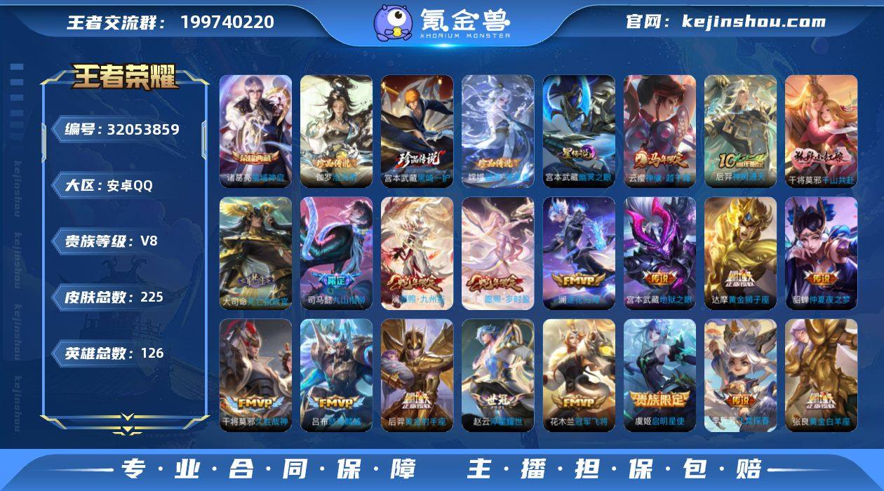 安卓Q-V8-最强王者段位-126英雄-225皮肤-1典藏皮肤-3珍品传说-19传说-62史诗 【英雄全皮】:司马懿全皮,大司命全皮,敖隐全皮,空空儿全皮,影全皮 【荣耀典藏】:诸葛亮星域神启 【珍品传说】:伽罗沧流箭,宫本武藏黑崎一护,嫦娥器灵落星盏 【传说皮肤】:云缨神骥越千峰,后羿神树通天,干将莫邪千山共赴,大司命死亡执政官,司马懿九山相柳,澜愿照九州拓,虞姬愿照岁时盈,澜逐花归海,吕布怒海麟威,赵云淬星耀世,李元芳飞鸢探春,虞姬启明星使,张良黄金白羊座,干将莫邪久胜战神,达摩黄金狮子座,花木兰冠军飞将,后羿黄金射手座,貂蝉仲夏夜之梦,宫本武藏地狱之眼 【限定皮肤】:姜子牙天穹之誓,狄仁杰阴阳师,赵云皇家上将,孙尚香蔷薇恋人,芈月白晶晶,元歌无心,马可波罗暗影游猎,狄仁杰魔术师,达摩沙漠行僧,项羽海滩派对,露娜一生所爱,兰陵王金庭之子,孙悟空至尊宝,孙悟空大圣娶亲,李元芳云中旅人,虞姬启明星使,钟馗驱傩正仪,鬼谷子五谷丰年,苏烈千军破阵,百里玄策原初追逐者,沈梦溪大漠名商,裴擒虎李小龙,鲁班大师探海日志,桑启海盐诗旅,阿古朵江河有灵,张良古海寻踪,高渐离燃音魔法,妲己灵卜魔法,鬼谷子天穹祈灯,沈梦溪龙舞盛年,鲁班七号蔬乡物语,李元芳蔬乡物语,刘邦剑破天穹,程咬金群星魔术团,镜青焰无极,项羽苍威无极,刘备异域游侠,周瑜熔金海岸 【年限皮肤】:澜愿照九州拓,虞姬愿照岁时盈 【赛季限定】:钟馗驱傩正仪,苏烈千军破阵,达摩沙漠行僧,兰陵王金庭之子,沈梦溪大漠名商,李元芳云中旅人,桑启海盐诗旅,鲁班大师探海日志,张良古海寻踪,鬼谷子天穹祈灯,刘邦剑破天穹,姜子牙天穹之誓,东皇太一噬灭天穹,太乙真人谧流熔炉,钟馗虚灵犬护,甄姬逆浪荇歌,亚瑟荣光之誓,百里玄策原初追逐者,项羽九幽镇关 【战令限定】:马可波罗暗影游...
