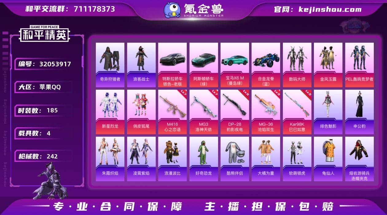 苹果 手Q-5粉装-5特效枪-4载具-4粉色飞行器-80923热力值-9王牌印记-185套装-242枪皮 【热门品类】:套装-奇异狩猎者,套装-浪客战士,套装-龟仙人,套装-浪漫波比,熔岩游骑兵连帽夹克 【粉色套装】:粉装-数码大师,粉装-金风玉露,粉装-PEL轰鸣竞梦者,粉装-新星烈龙,粉装-俏皮狐尾 【粉色枪皮等级】:M416-心之恋语(七级),Kar98K-巳巳如意(五级),DP-28-豹影疾电(五级),MG3-洛神天依(七级),MG-36-沧焰双生(五级) 【粉色载具】:特斯拉Model 3(冷光银),阿斯顿马丁DBS(绿),宝马X6 M(曼岛绿),合金龙骨(蓝) 【粉色枪皮】:M416-心之恋语,Kar98K-巳巳如意,DP-28-豹影疾电,MG3-洛神天依,MG-36-沧焰双生 【粉色飞行器】:甜蜜誓约飞行器,王牌四分卫飞行器,极意拳锋飞行器 【粉色降落伞】:百万伏特降落伞,凝视深渊降落伞,春暖花开降落伞,天启纪元降落伞,PEL轰鸣竞梦者降落伞,神秘黑猫降落伞,古堡领主降落伞,四圣焕新降落伞,扶摇飞仙降落伞,锦绣火鲤降落伞,星之彼岸降落伞,碧影闪光降落伞,荧海星豚降落伞,喜羊羊与灰太狼降落伞,异瞳寒姬降落伞,炫彩糖果降落伞 【稀有套装】:套装-龟仙人,套装-炫彩糖果,套装-紫幽梦,套装-蓝冰羽,套装-云朵鹅,套装-雪绒豹,套装-蜜露汐语,套装-朱霞炽焰,套装-凌霄紫焰,角色-申公豹,角色-绯色魅影 【稀有枪皮】:AKM-四圣焕新,AKM-夜灯,AKM-天启纪元,AKM-灼热熔岩,AKM-玉龙,AKM-破晓战魂,AKM-萌趣颜团子,AKM-虎虎生威,AKM-霓虹街区,M16A4-凝视深渊,M16A4-机械英豪,M16A4-生命誓言,M16A4-红色方程式,M16A4-蓝色火焰,M16A4-魔法学院,SCAR-L-浪客战士,SCAR-L-炫彩节奏,SCAR-L-甜蜜誓约,SCAR-L-生命誓言,SCAR-L-红色方程式,SCAR-L-黄金龙骨,M416-仓鼠灰灰,M416-夜灯,M416-红色方程式,M416-绯红前夜,M416-蓝色火焰,GR...