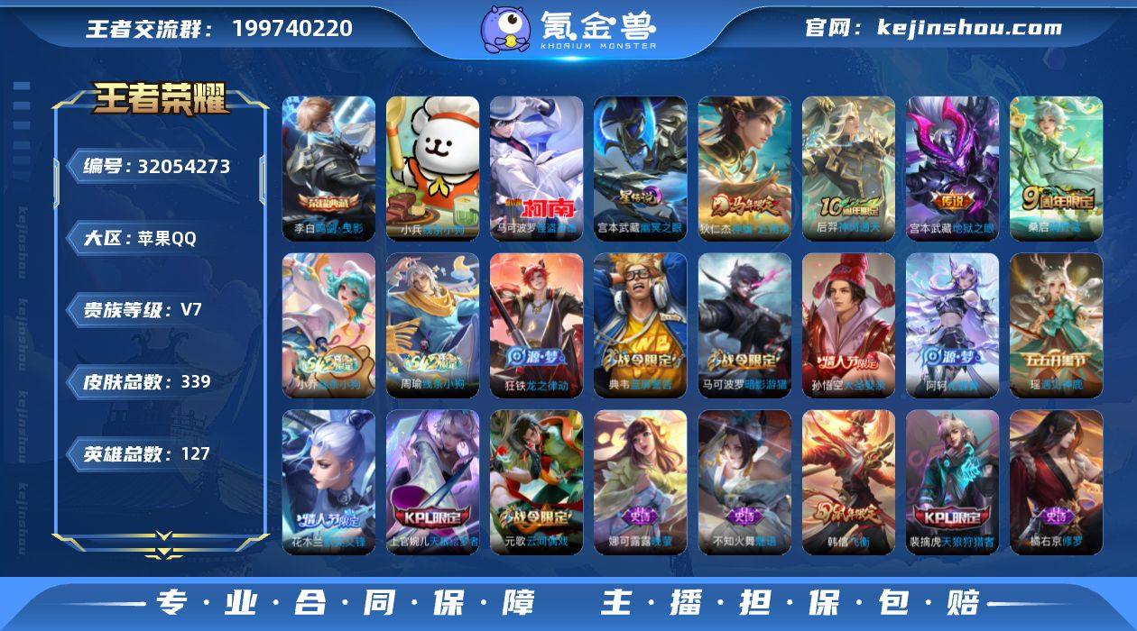 贵族等级:V7 典藏皮肤数:1 珍品无双皮肤数:0 无双皮肤数:0 珍品传说皮肤数:1 传说皮肤数:4 史诗皮肤数:90 皮肤数:339 英雄数:127 段位:星耀 卖家说:107w金币6w钻石