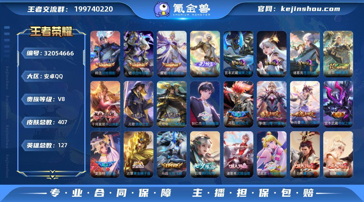 【马超全皮】实名: 可修改 贵族等级: V8 英雄数: 127 皮肤数: 407 荣耀水晶: 银白咏叹调,弑枪猎影,神鉴启示录 无双皮: 碎月剑心 星传说: 幽冥之眼,金色仲夏夜,苍灵仙君 传说皮: 黄金狮子座,猫影幻舞,久胜战神,仲夏夜之梦,地狱之眼,胖达荣荣,无双飞将,山海·炽霜斩,浮生妄,鹤归松栖(云缨),永恒水手月亮,夜礼服假面,琥珀纪元马超,乘龙·问璇玑,貂蝉曦玄引,吕布曦玄引,死亡执政官,诡秘之主,神树通天 限定皮: 遇见飞天,李小龙,游园惊梦,梁祝,魔法小厨娘,虎魄,神威,青春决赛季,天狼狩猎者,武陵仙君,高山流水,傲雪梅枪,寅虎·心曲,启示之音,枫霜尽,五谷丰年,山海·玄木吟,齐天大圣,鸣野蒿