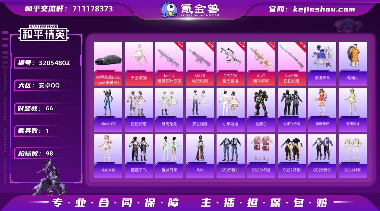 安卓 手Q-1粉装-5特效枪-1载具-3粉色飞行器-30602热力值-8王牌印记-66套装-98枪皮 【热门品类】:套装-浪漫天命,套装-龟仙人,角色-Mark.06 【粉色套装】:角色-千金淑猫 【粉色枪皮等级】:M416-电玩时刻(五级),GROZA-镜光银凌(五级),AUG-暖羊咩咩(五级),Kar98K-巳巳如意(五级),Mk14-精灵梦叶罗丽(七级) 【粉色载具】:兰博基尼Estoque(银翼灰) 【粉色枪皮】:M416-电玩时刻,GROZA-镜光银凌,AUG-暖羊咩咩,Kar98K-巳巳如意,Mk14-精灵梦叶罗丽 【粉色飞行器】:繁龙极客飞行器,英伦信使飞行器 【粉色降落伞】:初号机 觉醒Ver.降落伞,月影灵韵降落伞 【稀有套装】:套装-龟仙人,套装-巳巳如意,套装-雏菊兔兔,套装-萝兰蝴蝶,套装-小熊娃娃,角色-拉斐尔,套装-先驱飞行员,套装-糖糖葫芦,套装-青团波波,套装-棉花软糖,套装-燕燕于飞,套装-鱼渊荷华,角色-风玲 【稀有枪皮】:AKM-彩虹符号,AKM-破晓战魂,AKM-霓虹街区,AKM-龙的传人,M16A4-红色方程式,SCAR-L-红色方程式,M416-糯团青竹,M416-红色方程式,M416-蓝色火焰,AUG-幻影战神,AUG-耀粉歌者,蜜獾-天降萌叽,UZI-啾咪啾咪,UZI-天降萌叽,Vector-焰鹰斗篷,Vector-生命誓言,汤姆逊-天降萌叽,汤姆逊-炫彩节奏,汤姆逊-耀粉歌者,P90-巳巳如意,Kar98K-彩虹符号,Kar98K-红色方程式,AWM-焰鹰斗篷,Mini14-耀粉歌者,莫辛纳甘-蜜语绒猫,SVD-冷漠罗丽,S686-彩虹符号,S686-红色方程式,S686-巳巳如意,S12K-幻影战神,DBS-焰鹰斗篷,DBS-圣堂之誓,M249-彩虹符号,DP-28-焰鹰斗篷,DP-28-彩虹符号,MG3-幻世战舞者,撬棍-冷漠罗丽,破片手榴弹-巳巳如意 【其他套装】:套装-SS25特训,套装-SS26特训,套装-SS27特训,套装-SS28特训,套装-SS29特训,套装-光之冒险,套装-冷焰舞者,套装-吉莉礼服,套装-森林游猎者,套装-浪漫天...