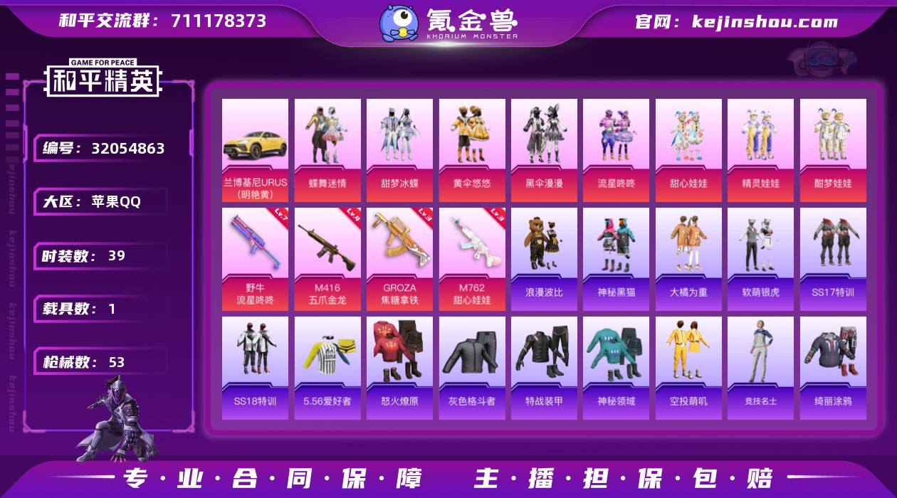 苹果 手Q-8粉装-4特效枪-1载具-1粉色飞行器-26140热力值-1王牌印记-39套装-53枪皮 【热门品类】:套装-浪漫波比 【粉色套装】:粉装-蝶舞迷情,粉装-甜梦冰蝶,粉装-黄伞悠悠,粉装-黑伞漫漫,粉装-流星咚咚,粉装-甜心娃娃,粉装-精灵娃娃,粉装-酣梦娃娃 【粉色枪皮等级】:M416-五爪金龙(四级),GROZA-焦糖拿铁(三级),M762-甜心娃娃(三级),野牛-流星咚咚(七级) 【粉色载具】:兰博基尼URUS(明艳黄) 【粉色枪皮】:M416-五爪金龙,GROZA-焦糖拿铁,M762-甜心娃娃,野牛-流星咚咚 【粉色飞行器】:春暖花开飞行器 【粉色降落伞】:春暖花开降落伞,神秘黑猫降落伞,红伞翩翩降落伞,海渊国主降落伞,绿意幻情降落伞,绚金瑰梦降落伞,流星咚咚降落伞,甜心娃娃降落伞,暗星紫秘降落伞,天之羽翼降落伞,焦糖拿铁降落伞,碧影闪光降落伞 【稀有枪皮】:AKM-彩虹符号,AKM-春暖花开,AKM-海渊国主,AKM-虎虎生威,SCAR-L-流星咚咚,SCAR-L-龙宫之主,M416-暗星紫秘,M416-神秘黑猫,GROZA-异彩先驱,GROZA-影袭,GROZA-春暖花开,AUG-流星咚咚,QBZ-神秘黑猫,M762-瑞龙福将,UZI-影袭,UMP45-春暖花开,UMP45-海渊国主,汤姆逊-异彩先驱,汤姆逊-炫彩节奏,MP5K-异彩先驱,M24-绿意幻情,Mini14-异彩先驱,Mini14-春暖花开,Mini14-海渊国主,Mini14-甜心娃娃,Mini14-耀粉歌者,Mini14-金玉无双,Mini14-龙宫之主,Mk14-暗星紫秘,Win94-瑞龙福将,AMR-翩跹演武,S686-幽冥伯爵,S1897-春暖花开,S1897-神秘黑猫,S1897-红伞翩翩,S12K-瑞龙福将,S12K-龙宫之主,DBS-暗星紫秘,MG3-瑞龙福将,MG3-甜心娃娃,P92-流星咚咚,P92-红伞翩翩 【其他套装】:套装-SS17特训,套装-SS18特训,套装-5.56爱好者,套装-怒火燎原,套装-灰色格斗者,套装-特战装甲,套装-神秘领域,套装-空投萌叽,套装-竞技名士,套装-...