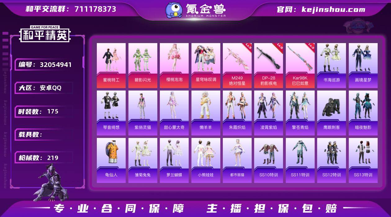 安卓 手Q-4粉装-3特效枪-0载具-2粉色飞行器-65661热力值-11王牌印记-175套装-219枪皮 【热门品类】:套装-龟仙人 【粉色套装】:粉装-蜜桃特工,粉装-碧影闪光,角色-樱桃泡泡,粉装-星穹咏叹调 【粉色枪皮等级】:Kar98K-巳巳如意(三级),M249-绝对恒星(七级),DP-28-豹影疾电(五级) 【粉色枪皮】:Kar98K-巳巳如意,M249-绝对恒星,DP-28-豹影疾电 【粉色飞行器】:春暖花开飞行器 【粉色降落伞】:绝对恒星降落伞,春暖花开降落伞,精灵迷巫降落伞,香水柠檬降落伞,暗夜玫瑰降落伞,洛神天依降落伞,太空嘟嘟降落伞,绯穹魔姬降落伞,喜羊羊与灰太狼降落伞,炫彩糖果降落伞 【稀有套装】:套装-龟仙人,角色-甜心蒙太奇,套装-雪国风尚,套装-炫彩糖果,套装-雏菊兔兔,套装-萝兰蝴蝶,套装-小熊娃娃,角色-都市丽猫,套装-朱霞炽焰,套装-凌霄紫焰,套装-擎苍青焰,玩偶服-懒羊羊,角色-紫俏灵猫,套装-书海巡游,套装-画境星梦,套装-琴音绮想 【稀有枪皮】:AUG-冰晶雪宝,AKM-夜灯,AKM-彩虹符号,AKM-灼热熔岩,AKM-破晓战魂,AKM-萌趣颜团子,AKM-虎虎生威,M16A4-夜灯,M16A4-幻世战舞者,M16A4-甜心亚梦,M16A4-红色方程式,M16A4-蓝色火焰,SCAR-L-夜灯,SCAR-L-炫彩节奏,SCAR-L-红色方程式,M416-夜灯,M416-糯团青竹,M416-红色方程式,M416-蓝色火焰,GROZA-异彩先驱,GROZA-彩虹符号,GROZA-影袭,GROZA-治愈之星,GROZA-田园牧歌,GROZA-蓝莓炮弹,AUG-天降萌叽,AUG-怪笑疯兔,AUG-耀粉歌者,AUG-青春冒险家,AUG-绝对恒星,QBZ-彩虹符号,QBZ-洛神天依,QBZ-神秘黑猫,QBZ-飞驰魅影,M762-天降萌叽,M762-牛气冲天,M762-瑞龙福将,Mk47-洛神天依,Mk47-青春冒险家,G36C-时空追击者,AC-VAL-天降萌叽,AC-VAL-快闪甜心,AC-VAL-甜心亚梦,蜜獾-垂柳戏鸭,蜜獾-天降萌叽,蜜獾-娇憨猪猪,ACE...