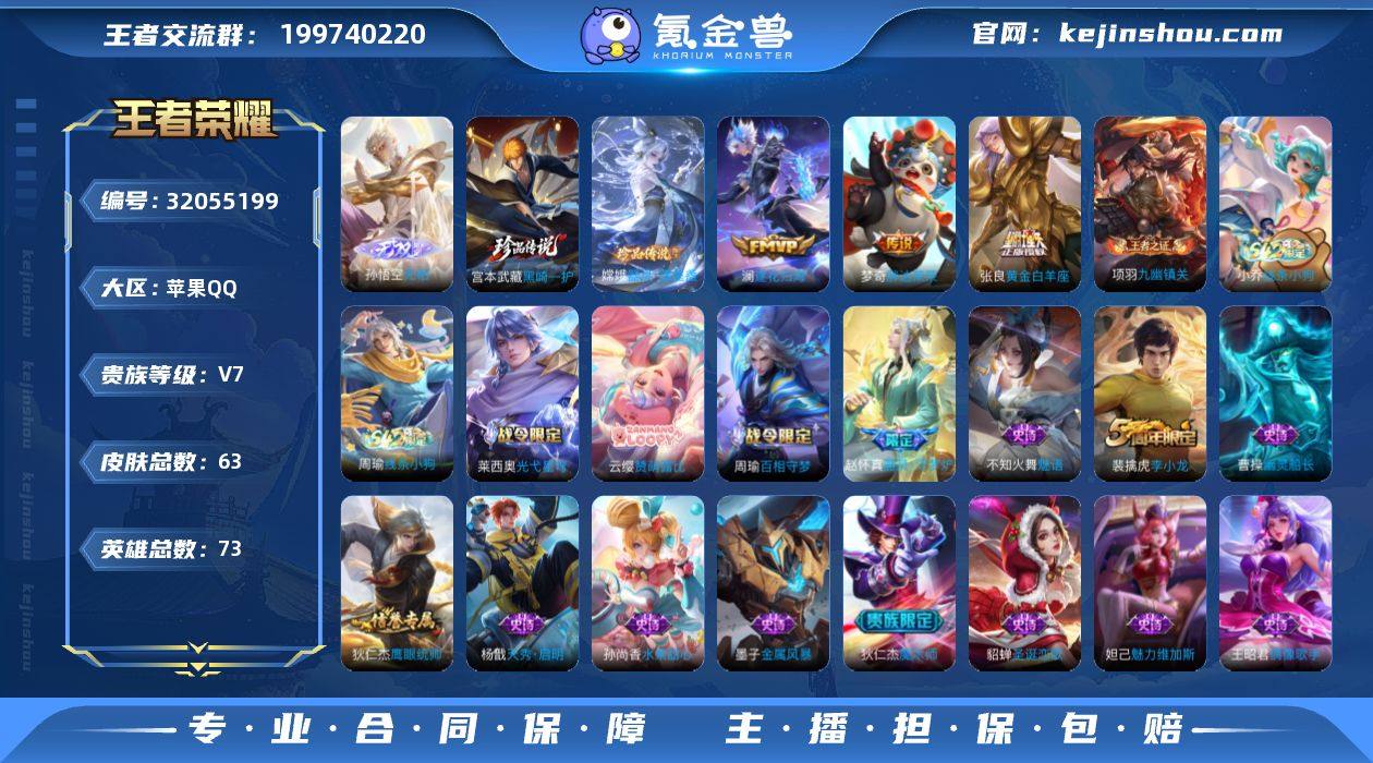 金标万战梦琪 金标云樱 实名: 可修改 贵族等级: V7 英雄数: 73 皮肤数: 63 无双皮: 无相 珍品传说: 器灵·落星盏,黑崎一护 传说皮: 黄金白羊座,胖达荣荣,澜逐花归海 限定皮: 李小龙