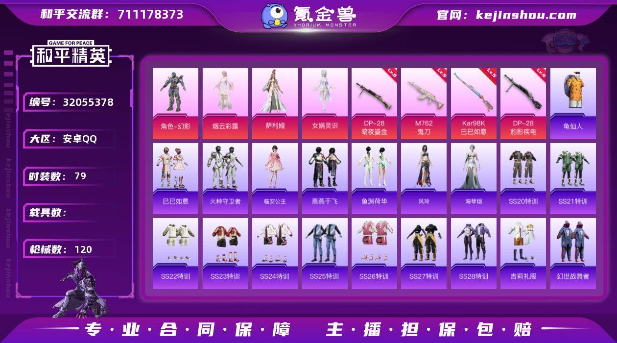 安卓 手Q-4粉装-4特效枪-0载具-2粉色飞行器-36294热力值-5王牌印记-79套装-120枪皮 【热门品类】:套装-龟仙人 【粉色套装】:角色-幻影,角色-烟云彩露,角色-萨利娅,角色-女娲灵识 【粉色枪皮等级】:M762-鬼刀(五级),Kar98K-巳巳如意(五级),DP-28-暗夜鎏金(六级),DP-28-豹影疾电(四级) 【粉色枪皮】:M762-鬼刀,Kar98K-巳巳如意,DP-28-暗夜鎏金,DP-28-豹影疾电 【粉色飞行器】:梦幻火箭飞行器,千面幻镜飞行器 【粉色降落伞】:星之彼岸降落伞,橘柚倾心降落伞,环太平洋降落伞,垂柳戏鸭降落伞,忍者神龟降落伞,鬼刀降落伞,樱桃泡泡降落伞,异瞳寒姬降落伞 【稀有套装】:套装-龟仙人,套装-巳巳如意,套装-火种守卫者,角色-临安公主,套装-燕燕于飞,套装-鱼渊荷华,角色-风玲,角色-海琴烟 【稀有枪皮】:AKM-破晓战魂,AKM-霓虹街区,AKM-龙的传人,M16A4-幻世战舞者,M16A4-蓝色火焰,SCAR-L-炫彩节奏,SCAR-L-玉兔迎春,M416-糯团青竹,M416-红色方程式,M416-蓝色火焰,GROZA-彩虹符号,GROZA-懵萌河马,GROZA-田园牧歌,AUG-2P战斗服款,AUG-甜蜜菠萝,AUG-耀粉歌者,QBZ-洛神天依,M762-绯红前夜,G36C-懵萌河马,AC-VAL-天降萌叽,蜜獾-天降萌叽,蜜獾-娇憨猪猪,UZI-啾咪啾咪,UZI-天降萌叽,UZI-娇憨猪猪,UZI-月影灵韵,UMP45-夜灯,UMP45-快乐主宰,UMP45-生命誓言,UMP45-蓝色火焰,Vector-生命誓言,Vector-田园牧歌,汤姆逊-天降萌叽,汤姆逊-暗夜鎏金,汤姆逊-耀粉歌者,AKS-74U-鬼刀,P90-甜蜜旋律,P90-巳巳如意,Kar98K-彩虹符号,Kar98K-红色方程式,AWM-黄金龙骨,SKS-炫彩节奏,SKS-圣域龙灵,VSS-田园牧歌,Mini14-涂山之恋,Mini14-耀粉歌者,SLR-娇憨猪猪,莫辛纳甘-懵萌河马,AMR-喜羊羊与灰太狼,AMR-鬼刀,M417-惊鸿侠骨,M200-惊鸿侠骨,S686-生命誓言,S686-巳巳如...
