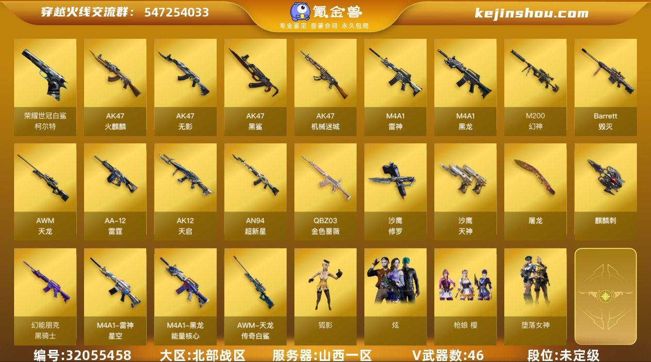 南方大区-48V-12王者-2炫金 【传说武器】:传说幽冥 【热门武器】:传说幽冥,修罗-古蛇迷踪,M200-竞技荣光,死亡之眼,荣耀世冠-雷神,Cat-刀锋,沙鹰-修罗*2,荣耀世冠-龙啸 【王者炫金武器】:炫金火麒麟,炫金毁灭 【音效卡】:擎天-云海游龙音效卡,Barrett-毁灭音效卡,Barrett-碧霄极光音效卡,炼狱-百战金芒-庆典舞曲音效卡,沙鹰-修罗-盛典舞曲音效卡 【皮肤】:雷神-暗月,雷神-机甲刑天皮肤,雷神-宇航兔皮肤,雷神-源计划2.0专属 皮肤,雷神-化蛇 皮肤,M4A1-再燃火线,火麒麟-平天大圣,毁灭-暗月,毁灭-黑曼巴 皮肤,毁灭-虹光风暴 皮肤,天启-暗月,修罗-星空,屠龙-春桃 皮肤,轻型军用手斧-再燃火线,擎天-秘银,擎天-蒸汽钟表 皮肤 【角色】:零,电竞教官-云悠悠,战地猎狐,青霞仙子 【人偶武器】:M4A1-雷神-精英刀锋,AWM-灵狐-15周年嘉年华,Cat-刀锋,迷你艾比,迷你超能女侍,迷你裂空之翼*2,迷你牛牛,迷你生化手雷*2,生化手雷-机甲核心 【暴走生化】:黑龙吞噬者,死亡之眼,超级对讲机 【挑战大师】:冰龙粉碎者-白马银枪,激光毁灭者III-白马银枪*2 【英雄级武器】:AK47-火麒麟,M4A1-黑龙,M4A1-雷神,AK12-天启,黑武士-锦绣游龙,荣耀世冠-雷神,Barrett-毁灭,M200-竞技荣光,炼狱-百战金芒,AA-12-雷霆,沙鹰-修罗*2,沙鹰-天神,柯尔特-竞技荣光,修罗-古蛇迷踪,USP-冥王,屠龙*3,擎天,擎天-竞技荣光*2,荣耀世冠-龙啸,麒麟刺-百战金芒,雷霆王者之锋-觉醒版,高爆手雷-竞技荣光*5,手雷-热带奇洋,高爆手雷-古蛇迷踪,高爆手雷-雷霆王者*2,闪光弹-雷暴,闪光弹-竞技荣光*3,闪光弹-云龙,闪光弹-玄豹*2,烟雾弹-竞技荣光*3,烟雾弹-云龙,烟雾弹-古蛇迷踪,M4A1-赤狱骑士,Barrett-碧霄极光 【特殊枪械】: