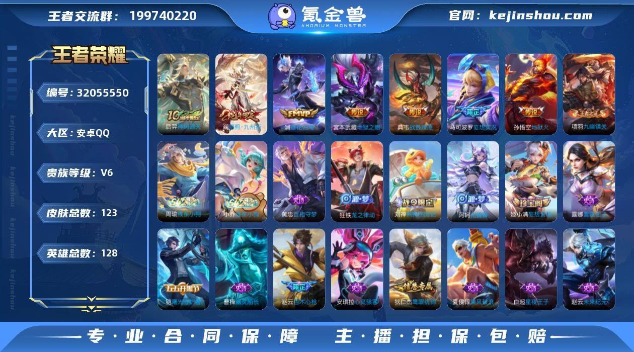 安卓Q-V6-最强王者段位-128英雄-123皮肤-7传说-26史诗【传说皮肤】:后羿神树通天,澜愿照九州拓,典韦战鼓燎原,澜逐花归海,马可波罗妄想实况,宫本武藏地狱之眼,孙悟空地狱火【限定皮肤】:大乔绒语心约,姜子牙天穹之誓,狄仁杰阴阳师,赵云皇家上将,赵云百木心枪,马可波罗妄想实况,狄仁杰魔术师,狄仁杰万华元夜,项羽海滩派对,程咬金演武夺筹,钟馗驱傩正仪,鲁班大师探海日志,姬小满妄想食味,周瑜熔金海岸【年限皮肤】:澜愿照九州拓【赛季限定】:狄仁杰万华元夜,程咬金演武夺筹,钟馗驱傩正仪,鲁班大师探海日志,姜子牙天穹之誓,东皇太一噬灭天穹,太乙真人谧流熔炉,钟馗虚灵犬护,甄姬逆浪荇歌,亚瑟荣光之誓,项羽九幽镇关【战令限定】:孙膑茶境仙,马超访茗客,刘禅鸭鸭历险记,沈梦溪鸭鸭历险记,周瑜线条小狗,小乔线条小狗【史诗皮肤】:周瑜线条小狗,小乔线条小狗,项羽九幽镇关,黄忠百相守梦,狂铁龙之律动,刘禅鸭鸭历险记,阿轲化蝶舞,孙膑茶境仙,姬小满妄想食味,赵云百木心枪,狄仁杰鹰眼统帅,白起星夜王子,李元芳逐浪之夏,铠曙光守护者,安琪拉心灵骇客,夏侯惇乘风破浪,张飞乱世虎臣,曹操幽灵船长,吕布圣诞狂欢,妲己魅力维加斯,孙尚香水果甜心,狄仁杰魔术师,王昭君偶像歌手,貂蝉圣诞恋歌,赵云未来纪元,赵云皇家上将,露娜紫霞仙子【其他皮肤】:鲁班七号班班快跑,桑启线条小狗,艾琳鹤鸣心笺,亚瑟荣光之誓,莱西奥踏浪烽翎,庄周锦麟游梦,云中君云械蓝图,甄姬逆浪荇歌,露娜命运加冕,阿古朵布丁狗之约,张良灵野札记,小乔秘证寻踪,苏烈春野闲踪,沈梦溪鸭鸭历险记,钟馗虚灵犬护,刘备浪漫序章,戈娅玫蓝誓约,明世隐景韶洛都,少司缘灵卦秘语,达摩爆裂喵拳,东皇太一金福满堂,西施雪境奇遇,马超访茗客,典韦铁骨偃魂,太乙真人谧流熔炉,苍苍林狼...