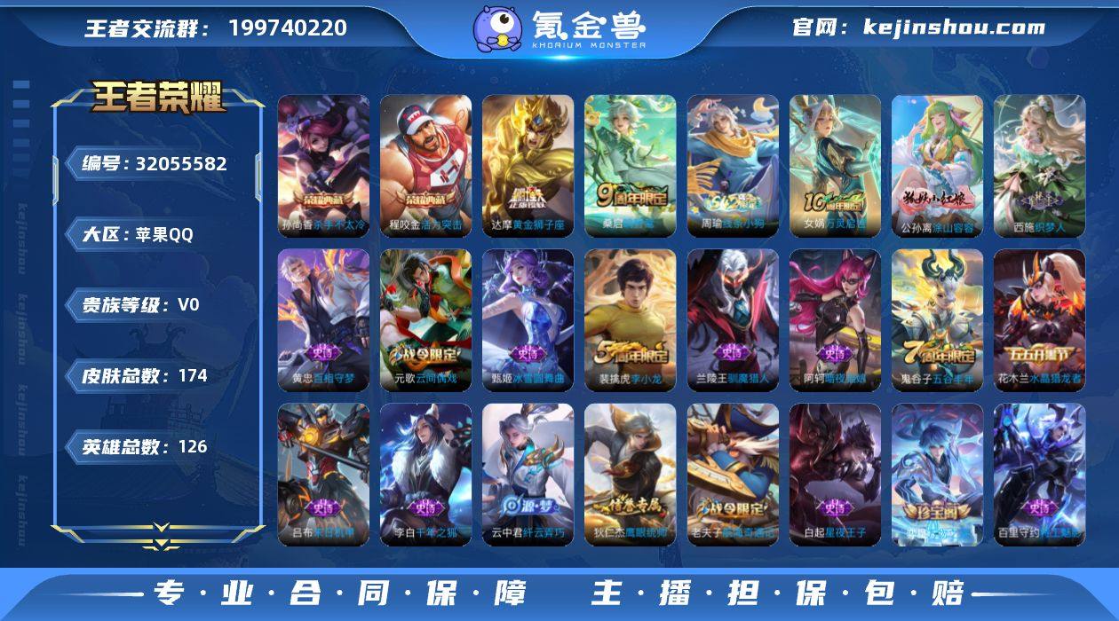 实名: 可修改 贵族等级: V0 英雄数: 126 皮肤数: 174 荣耀水晶: 活力突击,杀手不太冷 传说皮: 黄金狮子座 限定皮: 李小龙,五谷丰年,鸣野蒿