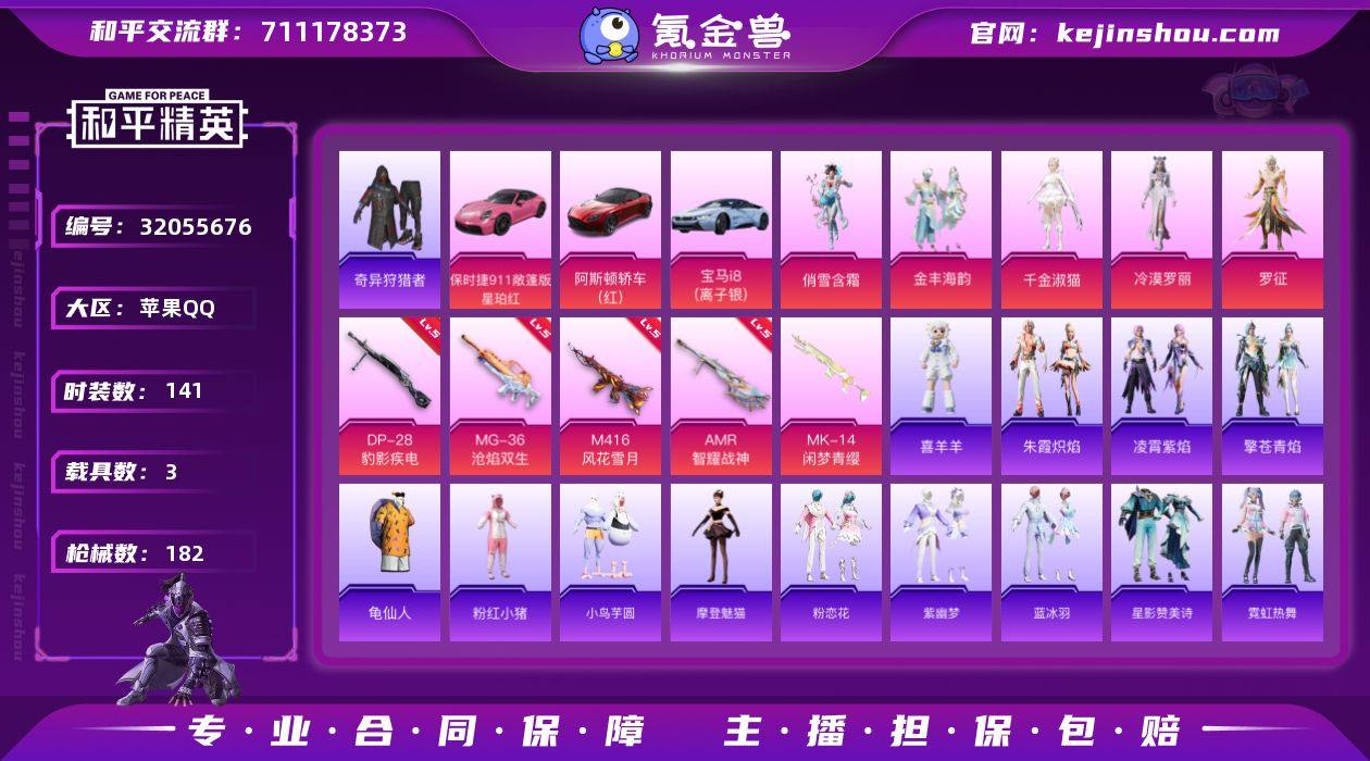 苹果 手Q-5粉装-5特效枪-3载具-3粉色飞行器-57174热力值-9王牌印记-141套装-182枪皮 【热门品类】:套装-奇异狩猎者,套装-龟仙人,套装-粉红小猪 【粉色套装】:粉装-俏雪含霜,粉装-金丰海韵,角色-千金淑猫,角色-冷漠罗丽,角色-罗征 【粉色枪皮等级】:M416-风花雪月(五级),AMR-智耀战神(五级),DP-28-豹影疾电(五级),MG-36-沧焰双生(五级) 【粉色载具】:阿斯顿马丁DBS(红),宝马i8(离子银),保时捷911 敞篷版(星珀红) 【粉色枪皮】:M416-风花雪月,Mk14-闲梦青缨,AMR-智耀战神,DP-28-豹影疾电,MG-36-沧焰双生 【粉色飞行器】:天之羽翼飞行器 【粉色降落伞】:齐天大圣降落伞,闪光银龙降落伞,太空嘟嘟降落伞,天星战神降落伞,智耀战神降落伞,星穹咏叹调降落伞,幻星舰长降落伞,幻彩电音降落伞,宁雨蝶降落伞,荧海星豚降落伞,喜羊羊与灰太狼降落伞,异瞳寒姬降落伞,炫彩糖果降落伞 【稀有套装】:套装-龟仙人,套装-小鸟芋圆,套装-炫彩糖果,角色-摩登魅猫,套装-粉恋花,套装-紫幽梦,套装-蓝冰羽,套装-星影赞美诗,套装-霓虹热舞,套装-彩虹兔,套装-云朵鹅,套装-雪绒豹,套装-混沌火种,套装-蜜露汐语,角色-绛羽幽主,套装-朱霞炽焰,套装-凌霄紫焰,套装-擎苍青焰,玩偶服-喜羊羊 【稀有枪皮】:AKM-夜灯,AKM-奇异狩猎者,AKM-彩虹符号,AKM-破晓战魂,AKM-虎虎生威,M16A4-幻世战舞者,M16A4-千金淑猫,SCAR-L-炫彩节奏,SCAR-L-玉兔迎春,SCAR-L-红色方程式,SCAR-L-啾咪啾咪,M416-摩登王国,M416-糯团青竹,M416-红色方程式,M416-蓝色火焰,M416-萌萌史莱姆,GROZA-彩虹符号,GROZA-懵萌河马,GROZA-荧海星豚,AUG-天降萌叽,AUG-耀粉歌者,M762-天降萌叽,M762-奇异狩猎者,M762-彩虹符号,M762-镭射皇者,M762-云朵鹅,M762-登顶巅峰,G36C-懵萌河马,G36C-星穹咏叹调...
