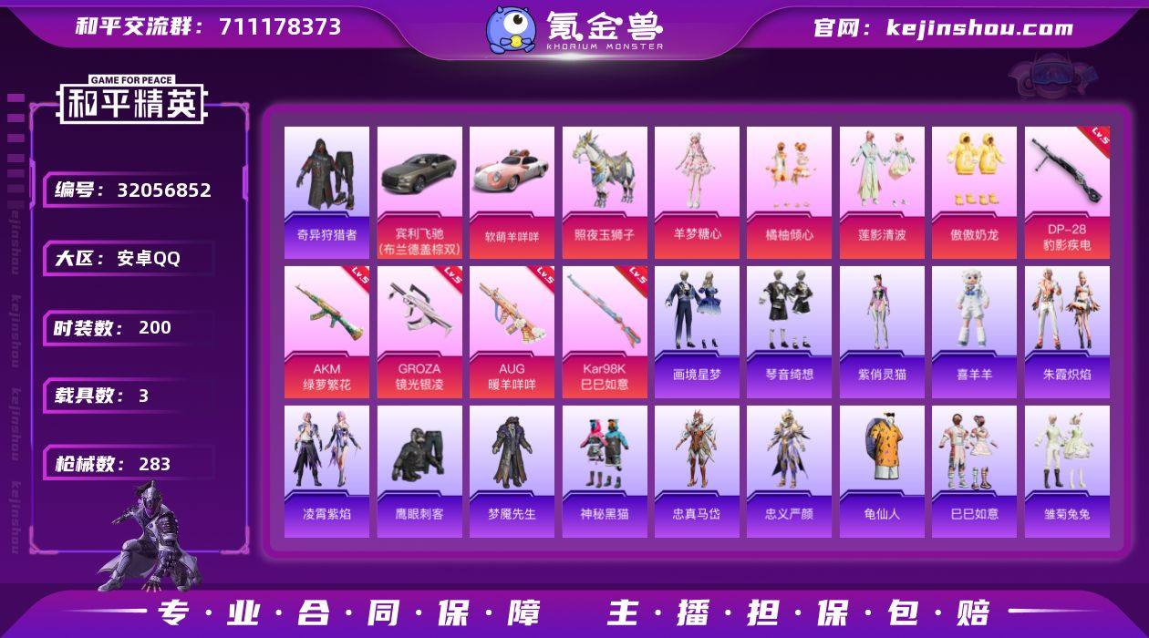 安卓 手Q-4粉装-5特效枪-3载具-5粉色飞行器-81568热力值-13王牌印记-200套装-283枪皮 【热门品类】:套装-奇异狩猎者,角色-忠真马岱,角色-忠义严颜,套装-龟仙人,大砍刀-青龙偃月刀,撬棍-龙胆亮银枪 【粉色套装】:粉装-橘柚倾心,粉装-莲影清波,粉装-傲傲奶龙,角色-羊梦糖心 【粉色枪皮等级】:AKM-绿萝繁花(五级),GROZA-镜光银凌(五级),AUG-暖羊咩咩(五级),Kar98K-巳巳如意(五级),DP-28-豹影疾电(五级) 【粉色载具】:宾利飞驰(布罗德盖棕双色),软萌羊咩咩,照夜玉狮子 【粉色枪皮】:AKM-绿萝繁花,GROZA-镜光银凌,AUG-暖羊咩咩,Kar98K-巳巳如意,DP-28-豹影疾电 【粉色飞行器】:镜光幻境飞行翼,龙翔九天飞行器,凤舞九天飞行器,极意拳锋飞行器 【粉色降落伞】:绝对恒星降落伞,百万伏特降落伞,四圣焕新降落伞,星之彼岸降落伞,暗夜玫瑰降落伞,青空秋雨降落伞,海螺星光降落伞,仲夏莫吉托降落伞,龙行天下降落伞,镜光幻境降落伞,繁龙极客降落伞,镜域双华降落伞,忍者神龟降落伞,盛世惊鸿降落伞,幻彩电音降落伞,冷漠罗丽降落伞,喜羊羊与灰太狼降落伞,异瞳寒姬降落伞,炫彩糖果降落伞 【稀有套装】:套装-龟仙人,套装-巳巳如意,套装-雪国风尚,套装-炫彩糖果,套装-雏菊兔兔,套装-萝兰蝴蝶,套装-小熊娃娃,套装-先驱飞行员,套装-糖糖葫芦,套装-青团波波,角色-临安公主,套装-燕燕于飞,套装-鱼渊荷华,套装-云朵鹅,套装-雪绒豹,套装-朱霞炽焰,套装-凌霄紫焰,玩偶服-喜羊羊,角色-紫俏灵猫,套装-画境星梦,套装-琴音绮想 【稀有枪皮】:AUG-冰晶雪宝,AKM-夜灯,AKM-彩虹符号,AKM-影袭,AKM-星之彼岸,AKM-灼热熔岩,AKM-破晓战魂,AKM-萌趣颜团子,AKM-虎虎生威,AKM-霓虹街区,AKM-龙的传人,M16A4-幻世战舞者,M16A4-快乐主宰,M16A4-红色方程式,M16A4-蓝色火焰...