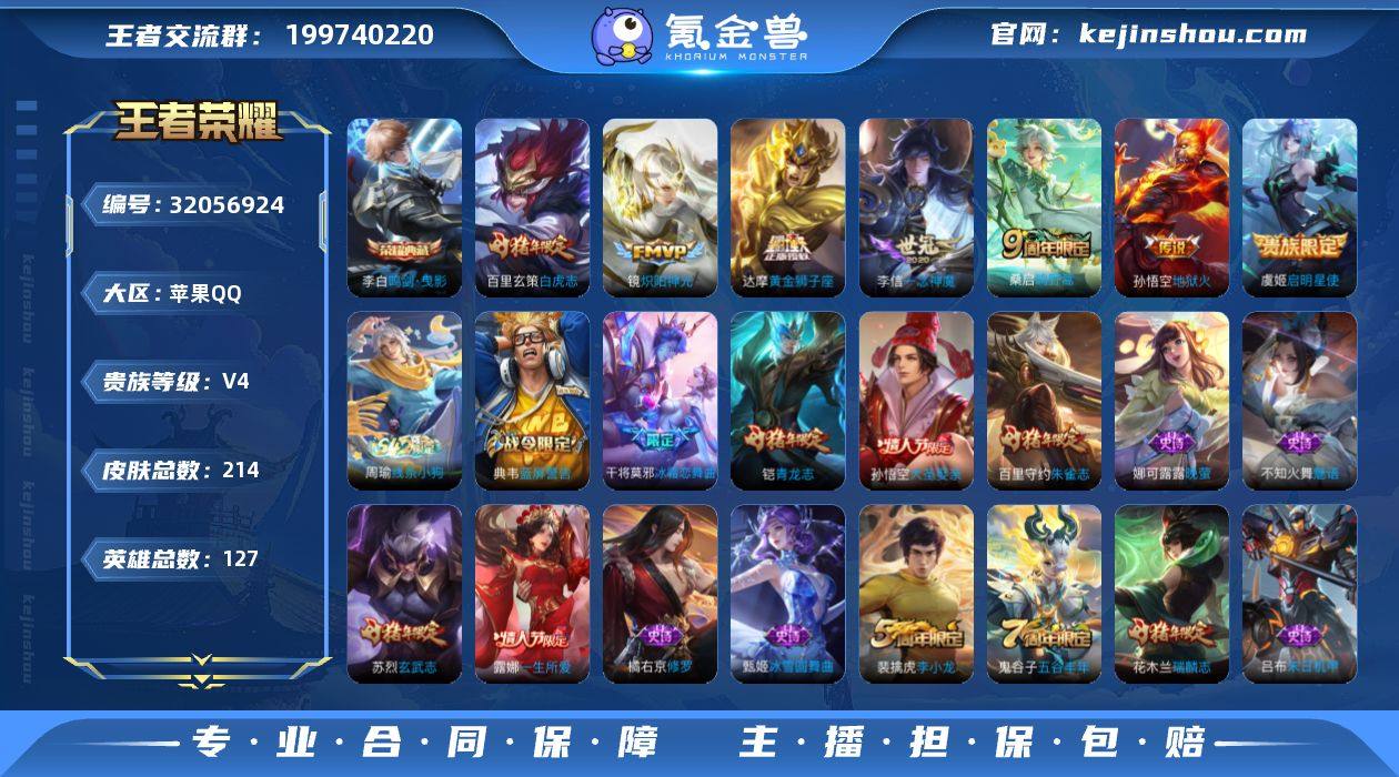 【WZ181085】苹果Q-V4-最强王者段位-127英雄-214皮肤-1典藏皮肤-7传说-50史诗【英雄全皮】:敖隐全皮【荣耀典藏】:李白鸣剑曳影【传说皮肤】:桑启鸣野蒿,镜炽阳神光,虞姬启明星使,李信一念神魔,达摩黄金狮子座,百里玄策白虎志,孙悟空地狱火【限定皮肤】:姜子牙天穹之誓,狄仁杰阴阳师,赵云皇家上将,墨子神迹守卫,嬴政白昼王子,孙尚香蔷薇恋人,鲁班七号狮舞东方,庄周高山流水,高渐离死亡摇滚,高渐离玩趣恶龙,吕布猎兽之王,夏侯惇朔风刀,甄姬游园惊梦,典韦蓝屏警告,狄仁杰魔术师,狄仁杰万华元夜,达摩沙漠行僧,项羽海滩派对,老夫子醍醐杖,老夫子航海奇遇记,程咬金演武夺筹,露娜一生所爱,兰陵王金庭之子,花木兰瑞麟志,孙悟空大圣娶亲,牛魔御旌,李元芳云中旅人,虞姬启明星使,钟馗神迹守卫,钟馗驱傩正仪,女娲朔望之晖,干将莫邪冰霜恋舞曲,雅典娜黎明之约,鬼谷子原初探秘者,鬼谷子五谷丰年,铠青龙志,苏烈玄武志,苏烈千军破阵,百里玄策白虎志,百里玄策原初追逐者,百里守约朱雀志,弈星混沌棋,梦奇顽趣,沈梦溪大漠名商,明世隐疑决卦,裴擒虎李小龙,裴擒虎擒涛扼浪,狂铁御狮,米莱狄御霄,盾山御銮,桑启海盐诗旅,艾琳女武神,张良古海寻踪,鬼谷子天穹祈灯,沈梦溪龙舞盛年,刘邦剑破天穹,程咬金群星魔术团,周瑜熔金海岸【年限皮肤】:花木兰瑞麟志,苏烈玄武志,百里玄策白虎志,百里守约朱雀志,铠青龙志【赛季限定】:狂铁御狮,米莱狄御霄,牛魔御旌,盾山御銮,夏侯惇朔风刀,弈星混沌棋,明世隐疑决卦,老夫子醍醐杖,鬼谷子原初探秘者,狄仁杰万华元夜,程咬金演武夺筹,钟馗驱傩正仪,苏烈千军破阵,达摩沙漠行僧,兰陵王金庭之子,沈梦溪大漠名商,李元芳云中旅人,桑启海盐诗旅,裴擒虎擒涛扼浪,张良古海寻踪,鬼谷子天穹祈灯,刘邦剑破天穹,姜子牙天...