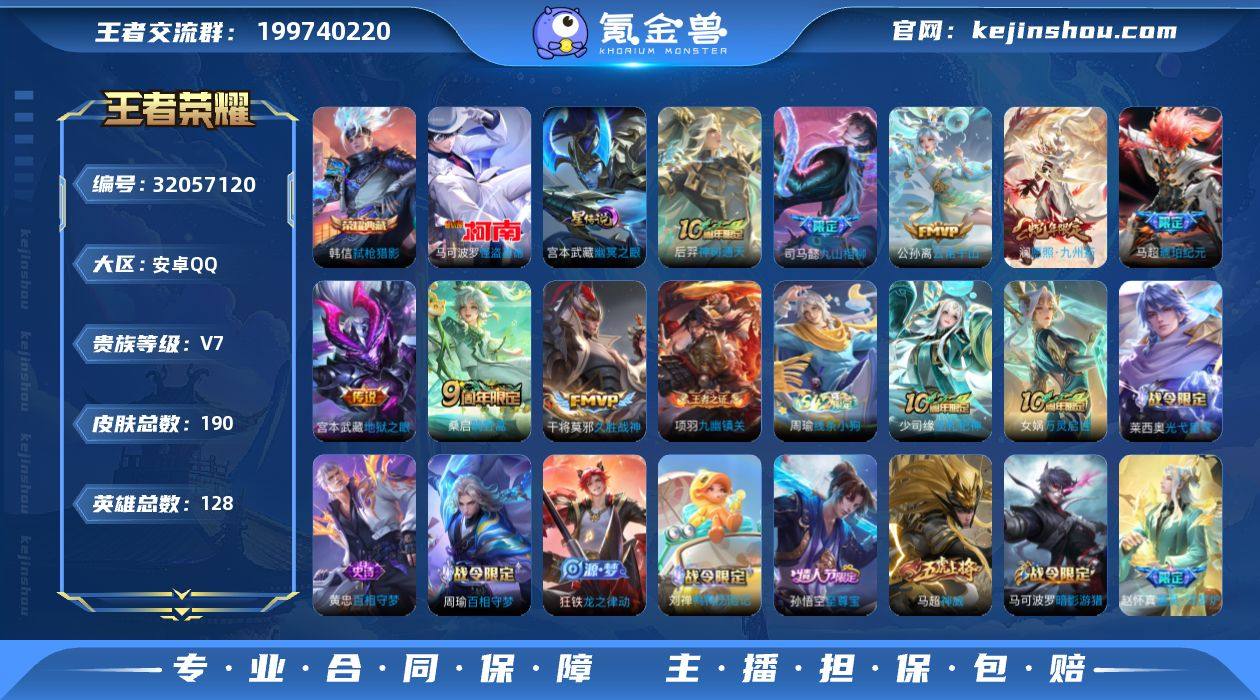 还有一颗荣耀水晶未兑换 司马懿全皮 实名: 可修改 贵族等级: V7 英雄数: 128 皮肤数: 190 荣耀水晶: 弑枪猎影 珍品传说: 怪盗基德 星传说: 幽冥之眼 传说皮: 久胜战神,地狱之眼,琥珀纪元马超,云诺千山,九山相柳,神树通天 限定皮: 梁祝,神威,至尊宝,鸣野蒿,愿照·九州拓