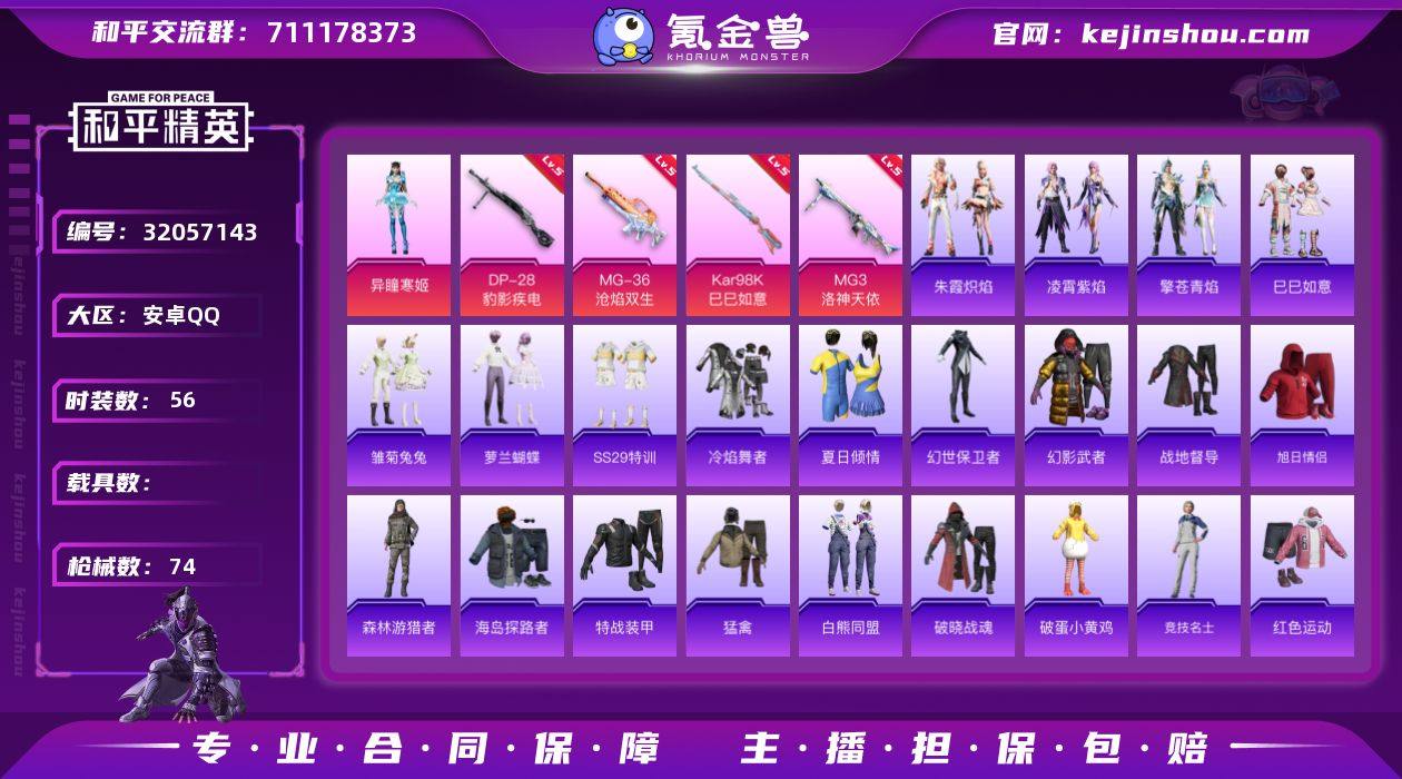 安卓 手Q-1粉装-4特效枪-0载具-0粉色飞行器-18967热力值-2王牌印记-56套装-74枪皮 【粉色套装】:角色-异瞳寒姬 【粉色枪皮等级】:Kar98K-巳巳如意(五级),DP-28-豹影疾电(五级),MG3-洛神天依(五级),MG-36-沧焰双生(五级) 【粉色枪皮】:Kar98K-巳巳如意,DP-28-豹影疾电,MG3-洛神天依,MG-36-沧焰双生 【粉色降落伞】:洛神天依降落伞,忍者神龟降落伞 【稀有套装】:套装-巳巳如意,套装-雏菊兔兔,套装-萝兰蝴蝶,套装-朱霞炽焰,套装-凌霄紫焰,套装-擎苍青焰 【稀有枪皮】:SCAR-L-夜灯,M416-红色方程式,AUG-天降萌叽,QBZ-洛神天依,M762-彩虹符号,Mk47-洛神天依,ARX-凌霄紫焰,UZI-啾咪啾咪,UZI-红色方程式,UMP45-夜灯,UMP45-生命誓言,Vector-生命誓言,汤姆逊-耀粉歌者,JS9-凌霄紫焰,P90-巳巳如意,Kar98K-洛神天依,SKS-炫彩节奏,S686-巳巳如意,S12K-夜灯,M249-破晓战魂,MG-36-凌霄紫焰,P92-凌霄紫焰,平底锅-凌霄紫焰,破片手榴弹-巳巳如意 【其他套装】:套装-SS29特训,套装-冷焰舞者,套装-夏日倾情,套装-幻世保卫者,套装-幻影武者,套装-战地督导,套装-旭日情侣,套装-森林游猎者,套装-海岛探路者,套装-特战装甲,套装-猛禽,套装-白熊同盟,套装-破晓战魂,套装-破蛋小黄鸡,套装-竞技名士,套装-红色运动,套装-缤纷果语,套装-蓝彩潮人,套装-街头潮人,套装-魅力单车,套装-黄色名流,套装-黄色运动,套装-弄潮海豚,套装-电音精灵,套装-天籁歌者,套装-创世·幻影 【营地ID】:973558247