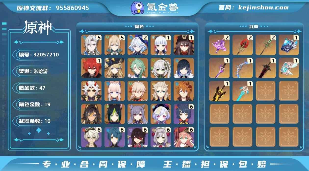 邮箱: 未绑定 总黄数: 47 冒险等级: 59 5命金色角色: 五命琴,五命那维莱特 2命金色角色: 二命芙宁娜 1命金色角色: 一命迪卢克,一命神里绫华,一命胡桃 0命金色角色: 枫原万叶,七七,刻晴,达达利亚,阿贝多,珊瑚宫心海,荒泷一斗,夜兰,提纳里,纳西妲,迪希雅,白术,娜维娅 拥有武器: 狼的末路,雾切之回光,天空之卷,和璞鸢,天空之刃,无工之剑,护摩之杖,冬极白星,神乐之真意,万世流涌大典 2精武器: 和璞鸢,护摩之杖,神乐之真意 1精武器: 狼的末路,雾切之回光,天空之卷,天空之刃,无工之剑,冬极白星,万世流涌大典 亮点: Y1-YH9088白术,迪希雅,纳西妲,提纳里,枫原万叶,达达利亚,珊瑚宫心海,阿贝多,七七,刻晴,荒泷一斗,夜兰,娜维娅,胡桃,神里绫华,迪卢克,芙宁娜,琴,那维莱特,班尼特,诺艾尔,北斗,香菱,罗莎莉亚,芭芭拉,雷泽,迪奥娜,行秋,菲谢尔,柯莱,鹿野院平藏,托马,早柚,烟绯,狼的末路,无工之剑,天空之刃,天空之卷,雾切之回光,冬极白星,万世流涌大典,护摩之杖,和璞鸢,神乐之真意,
