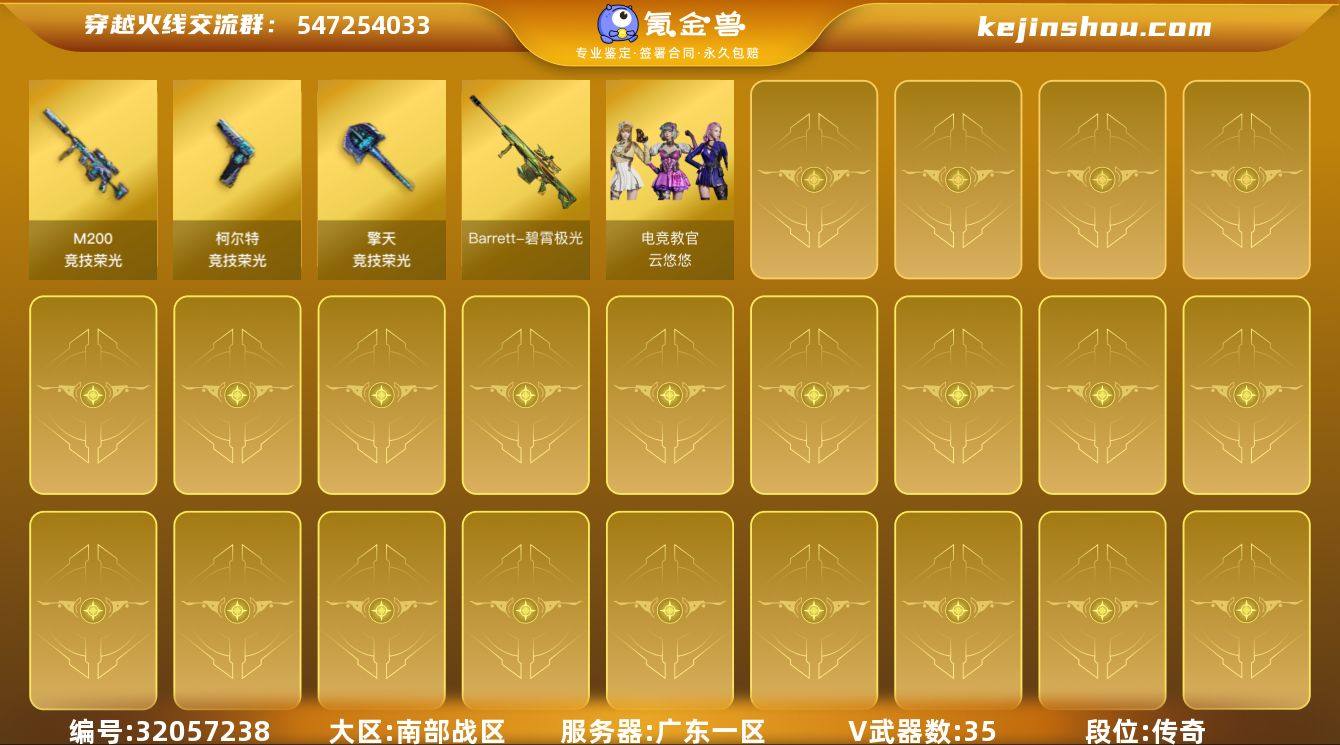【ky5654】广东一区-37V-0王者武器数-0炫金武器数 【热门武器】:M200-竞技荣光 【角色】:电竞教官-云悠悠,云海玲珑,风暴女,娟娟,兰妹妹,潘多拉-甜心教官,蛇姬,铁骑荣耀 【人偶武器】:迷你生化手雷 【英雄级武器】:M200-竞技荣光,柯尔特-竞技荣光,擎天-竞技荣光*3,高爆手雷-竞技荣光*7,闪光弹-竞技荣光*9,烟雾弹-竞技荣光*9,烟雾弹-荣耀世冠EP,Barrett-碧霄极光 【道具】:BS战队炫彩背包,CFS限定背包,云山科技背包,炫彩背包-诺拉,哔哩哔哩名片,女皇终结者-魔龙之吻,绿色巨人,灵魂忍者,迷雾幽灵,夺命之镰,防化服*3,流光-鎏金之域,电玩兔兔表情,动感闪耀表情,防弹头盔*3,防弹衣*3,C4工具钳*3,手雷包*3 【特殊枪械】: