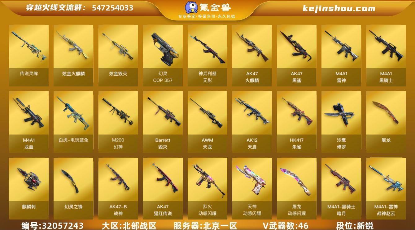 【穿越火线CF-2941】北京一区-46V-5王者-2炫金 【传说武器】:传说灵眸 【热门武器】:传说灵眸,HK417-朱雀,M4A1-青龙*2,M200-幻神*2,白虎-电玩蓝兔,M4A1-黑骑士*2,COP 357-幻灵,沙鹰-修罗*2 【王者炫金武器】:炫金火麒麟,炫金毁灭 【音效卡】:屠龙-动感闪耀 音效卡,M4A1-黑骑士音效卡,Barrett-极光音效卡 【稀有皮肤】:M200-幻神-黄忠皮肤,幻神-巅峰荣耀,幻神-降龙,M200-幻神-荣耀世冠白鲨,幻神-纸灯龙皮肤,白虎-电玩粉兔皮肤,M4A1-战神赵云,火麒麟-平天大圣,火麒麟-心动糖果,黑骑士-暗月,毁灭-冠军之怒,毁灭-黑大圣皮肤 【角色】:王者樱-热浪之夏,王者-迷迭香 【人偶武器】:巴雷特-零-水下丽影,AWM-灵狐-15周年嘉年华,M4A1-雷神-精英刀锋,迷你超能女侍,生化手雷-机甲核心 【暴走生化】:超级对讲机 【挑战大师】:神圣爆裂者-末日III,冰龙粉碎者-白马银枪 【英雄级武器】:COP 357-幻灵,幻灵之锋,烈火-动感闪耀,天神-动感闪耀,屠龙-动感闪耀,手雷-动感闪耀,HK417-朱雀,M4A1-青龙*2,白虎-电玩蓝兔,无影-神兵利器,M4A1-雷神,M4A1-黑骑士*2,AK47-火麒麟*2,AK12-天启,AWM-天龙,Barrett-毁灭,M4A1-龙血,M200-幻神*2,AK47-黑鲨,AK-47-猩红传说*2,AK47-B-战神,沙鹰-修罗*2,麒麟刺*3,屠龙 【特殊枪械】:2黑骑士