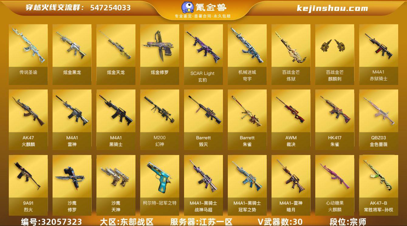【ky6124】江苏一区-36V-1王者武器数-3炫金武器数 【传说武器】:传说圣谕 【热门武器】:传说圣谕,QBZ03-金色蔷薇,HK417-朱雀,M200-幻神,柯尔特-冠军之特,M4A1-黑骑士,羊驼玩偶,沙鹰-修罗,Knife-冠军之刃,黄金猫猫手套-白鲨 【王者炫金武器】:炫金黑龙,炫金天龙,炫金修罗 【音效卡】:M4A1-黑骑士音效卡,Barrett-毁灭音效卡,N9语音包,炼狱-百战金芒-庆典舞曲音效卡 【皮肤】:幻神-冠军之幻,幻神-动感闪耀 皮肤,QBZ03-冠军之薇,QBZ03-金色蔷薇-拼搏,裁决-叶芒苍灵 皮肤,雷神-暗月,雷神-冠军之魄,M4A1-再燃火线,火麒麟-冠军之心,火麒麟-心动糖果,毁灭-冠军之怒,黑骑士-冠军之势,黑骑士-战神马超,AK47-B-常胜将军-孙权*3,修罗-冠军之魂,轻型军用手斧-再燃火线 【角色】:雨棠,机械姬,零·纪元,战地猎狐,葵-阿尔法武装,虎妞,嘉年华灵狐,疾风,灵狐-花神,灵狐者-X,麻雀,斯沃特-X,蜀雪,雪莉杨-摸金校尉,职业选手 【人偶武器】:天龙-曼陀罗,异变清道夫-蛇影双骄*2,AWM-灵狐-15周年嘉年华,迷你超能女侍 【暴走生化】:超级对讲机 【英雄级武器】:AK47-火麒麟*2,M4A1-雷神,M4A1-黑骑士,HK417-朱雀,SCAR Light-玄豹,QBZ03-金色蔷薇,9A91-烈火,加利尔ACE-天袭,机械迷城-穹宇,Barrett-毁灭,AWM-裁决,M200-幻神,Barrett-朱雀,炼狱-百战金芒,悦蓝-惊涛骇浪-觉醒版,沙鹰-修罗,沙鹰-天神,柯尔特-冠军之特,麒麟刺-百战金芒,高爆手雷-玄豹,烟雾弹-玄豹*3,M4A1-赤狱骑士 【道具】:AG战队炫彩背包,BS战队炫彩背包,云山科技背包,女皇终结者-背包,百战金芒炫彩背包,超级背包,女皇终结者-魔龙之吻,救世主-黑桃战神,绿色巨人,灵魂忍者,迷雾幽灵,夺命之镰,防化服*3,金色流光-枪王排位*2,星辰流光-枪王排位,流光-鎏金之域,流光-再燃火线,枪王排位2...