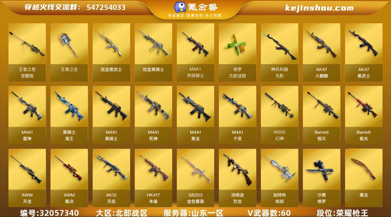 【ky4941】山东一区-62V-2王者-2炫金 【热门武器】:QBZ03-金色蔷薇,HK417-朱雀,M4A1-青龙,M200-幻神,修罗-古蛇迷踪,死亡之眼,M4A1-黑骑士,汤姆逊-烈龙*6,加特林-炼狱,斯泰尔-蝴蝶,降世魔童,USP-雷暴,沙鹰-修罗*2 【王者炫金武器】:王者之击,炫金骑士,炫金武士 【音效卡】:AK47-火麒麟音效卡,M4A1-雷神音效卡 【皮肤】:幻神-电竞之星 皮肤,雷神-暗月,雷神-耀金皮肤,黑骑士-暗月,AWM-天龙-传奇白鲨,极光-能量核心*2 【角色】:零,王者春,蛇隐宗,嘉年华灵狐,娟娟,潘多拉-X,潜龙队-X,蛇姬,铁骑荣耀,新娜塔莎,影武者-X 【人偶武器】:斯泰尔-蝴蝶,AWM-灵狐-15周年嘉年华,降世魔童 【暴走生化】:死亡之眼,超级对讲机 【英雄级武器】:M4A1-千变,AK47-火麒麟*3,M4A1-黑龙,M4A1-雷神*3,M4A1-黑骑士,M4A1-死神,AK47-黑武士*3,AK12-天启*3,M4A1-青龙,HK417-朱雀,无影-神兵利器,QBZ03-金色蔷薇,黑骑士-海王,AWM-天龙,Barrett-毁灭*3,Barrett-极光,AWM-裁决,M200-幻神,王者之怒-觉醒版,加特林-炼狱,汤姆逊-烈龙*6,沙鹰-修罗*2,USP-雷暴,修罗-古蛇迷踪,屠龙*2,龙啸,麒麟刺,斩神刀-雷暴,高爆手雷-雷暴*4,闪光弹-雷暴*4,烟雾弹-雷暴*4,M4A1-赤狱骑士 【道具】:CFS限定背包,亚洲杯纪念炫彩背包,古蛇迷踪炫彩背包,战舰背包,炫彩背包,超级背包,救世主-黑桃战神,绿色巨人,灵魂忍者,变异宝贝,迷雾幽灵,生化弹匣*2,夺命之镰,防化服*2,金色流光-枪王排位*2,星辰流光-枪王排位,枪王排位28赛季金色流光,枪王排位29赛季金色流光,CFPL选手表情-第1套,EP战队名片,EP战队喷图,EP战队击杀图标,防弹头盔*8,防弹衣*8,C4工具钳*4,手雷包*5 【特殊枪械】:蝴蝶斯泰尔+6烈龙,1黑骑士,6烈龙,1炼狱,1蝴蝶斯泰尔