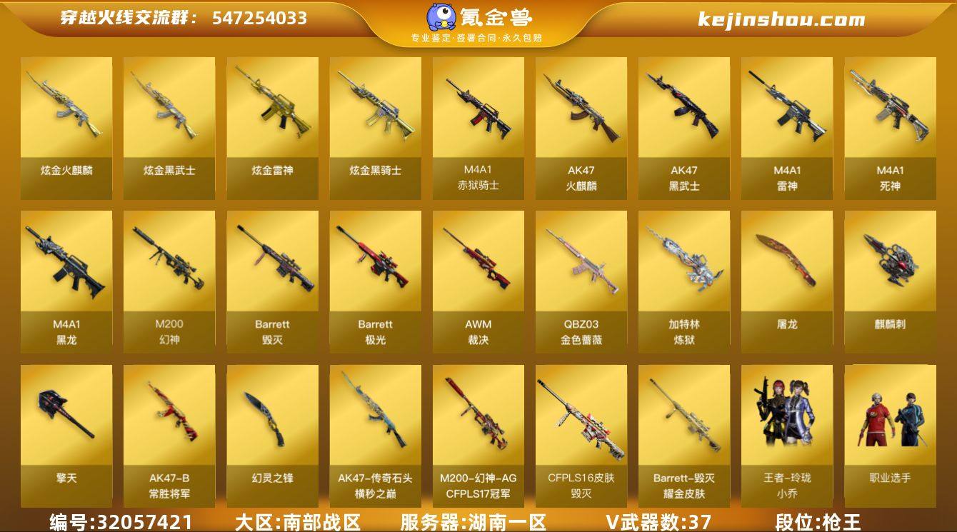 【商品标题】:湖南一区-37V-5王者-4炫金 【热门武器】:QBZ03-金色蔷薇,M200-幻神,牛牛-AK47,加特林-炼狱*2,金刚伞 【王者炫金武器】:炫金火麒麟,炫金骑士,炫金雷神,炫金武士 【音效卡】:M200-幻神音效卡,M4A1-雷神音效卡 【稀有皮肤】:幻神-AG-CFPLS17冠军,传奇石头-横秒之巅,毁灭耀金皮肤,毁灭-SV-CFPLS16冠军 【角色】:王者玲珑-小乔,灵狐者-职业经理,职业选手 【人偶武器】:牛牛-AK47,闪光弹-小乔,闪光弹-貂蝉,高爆手雷-大乔 【挑战大师】:激光毁灭者III-白马银枪 【英雄级武器】:幻灵之锋*2,QBZ03-金色蔷薇,M4A1-雷神,M4A1-黑龙,M4A1-死神,加特林-炼狱*2,AK47-火麒麟,AK47-黑武士,Barrett-毁灭,Barrett-极光,AWM-裁决,M200-幻神,AK47-B-常胜将军,M4A1-赤狱骑士,麒麟刺,擎天*2,屠龙*3 【特殊枪械】:2炼狱