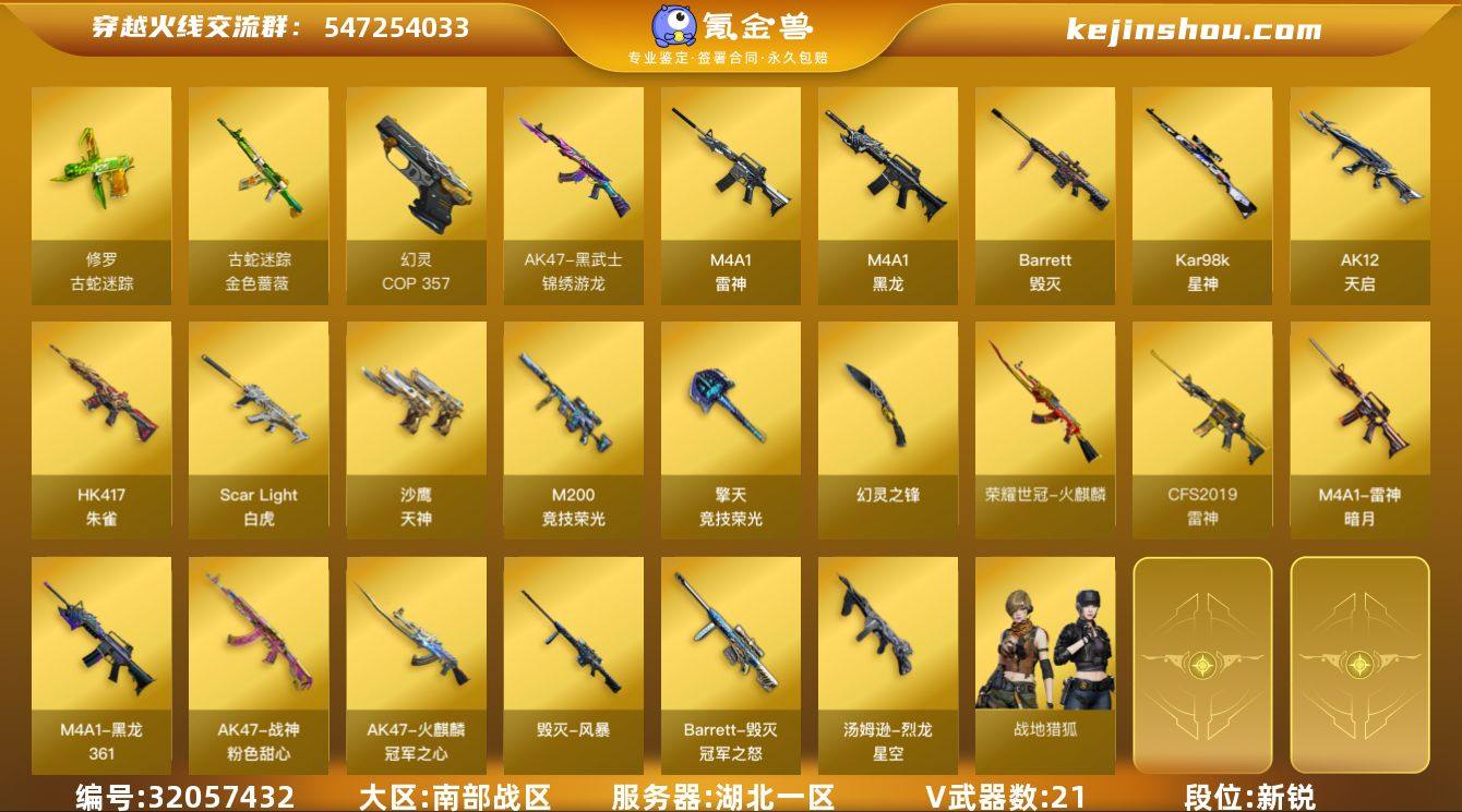 湖北一区-22V-0王者-0炫金 【热门武器】:Scar Light-白虎,HK417-朱雀,金色蔷薇-古蛇迷踪,修罗-古蛇迷踪,M200-竞技荣光,荣耀世冠-火麒麟,Kar98K-星神,羊驼玩偶,雷神-小红,COP 357-幻灵 【音效卡】:Barrett-毁灭音效卡,Kar98K-星神音效卡 【皮肤】:烈龙-星空,雷神-暗月,M4A1-雷神-CFS 2019,雷神-化蛇 皮肤,火麒麟-冠军之心,毁灭-冠军之怒,毁灭-风暴,M4A1-黑龙-361,战神-粉色甜心皮肤 【角色】:战地猎狐,蛇隐宗,修道士,风暴女,兰-新年限定,龙儿,潘多拉-X,潘多拉-甜心教官,蛇姬,维纳斯,雪莉杨,夜玫瑰-宠粉 【人偶武器】:雷神-小红,海滩汪汪-巴雷特 【暴走生化】:超级对讲机 【挑战大师】:冰龙粉碎者-白马银枪,神圣爆裂者-末日III 【英雄级武器】:M4A1-黑龙,M4A1-雷神,AK12-天启,HK417-朱雀,Scar Light-白虎,黑武士-锦绣游龙,金色蔷薇-古蛇迷踪,荣耀世冠-火麒麟,Barrett-毁灭,Kar98K-星神,M200-竞技荣光,沙鹰-天神,COP 357-幻灵,修罗-古蛇迷踪,幻灵之锋,擎天-竞技荣光,高爆手雷-竞技荣光*2,高爆手雷-古蛇迷踪,闪光弹-雷暴,闪光弹-幻灵,闪光弹-竞技荣光,烟雾弹-雷暴,烟雾弹-幻灵,烟雾弹-古蛇迷踪 【道具】:CFS限定背包,古蛇迷踪炫彩背包,背包-葫芦兄弟,超级背包,救世主-黑桃战神,绿色巨人,灵魂忍者,迷雾幽灵,夺命之镰,防化服*2,金色流光-枪王排位,星辰流光-枪王排位,巅峰赛先锋-金色流光,枪王排位28赛季金色流光,枪王排位29赛季金色流光,古蛇迷踪打击特效,蛇隐宗表情,EP战队名片,C4-再燃火线,防弹头盔*4,防弹衣*4,C4工具钳*5,手雷包*5 【特殊枪械】:1白虎
