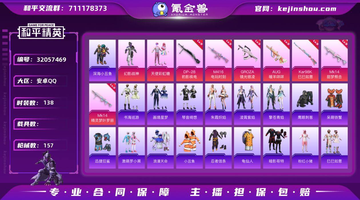 安卓 手Q-2粉装-12特效枪-0载具-1粉色飞行器-43130热力值-4王牌印记-138套装-157枪皮 【热门品类】:套装-浪漫天命,套装-深海小丑鱼,套装-小丑鱼,套装-忍者信条,套装-龟仙人,套装-暗影哥特,套装-粉红小猪 【粉色套装】:粉装-幻影战神,粉装-天使彩虹糖 【粉色枪皮等级】:M416-电玩时刻(五级),GROZA-镜光银凌(五级),AUG-暖羊咩咩(五级),ACE32-萌骑漫游(一级),UMP45-萌骑冒险(三级),AKS-74U-森灵之息(五级),Kar98K-巳巳如意(五级),Mk14-精灵梦叶罗丽(三级),Mk14-甜梦熊击(五级),Mk14-福马献瑞(三级),AA12-G-萌骑幻想(四级),DP-28-豹影疾电(五级) 【粉色枪皮】:M416-电玩时刻,GROZA-镜光银凌,AUG-暖羊咩咩,ACE32-萌骑漫游,UMP45-萌骑冒险,AKS-74U-森灵之息,Kar98K-巳巳如意,Mk14-精灵梦叶罗丽,Mk14-甜梦熊击,Mk14-福马献瑞,AA12-G-萌骑幻想,DP-28-豹影疾电 【粉色飞行器】:炫彩糖果飞行器 【粉色降落伞】:幻影战神降落伞,甜心宝贝降落伞,洛神天依降落伞,未来歌姬降落伞,精灵梦叶罗丽降落伞,炫彩糖果降落伞 【稀有套装】:套装-龟仙人,套装-巳巳如意,套装-雪国风尚,套装-炫彩糖果,套装-马上来财,角色-临安公主,套装-燕燕于飞,套装-鱼渊荷华,套装-霓虹热舞,套装-朱霞炽焰,套装-凌霄紫焰,套装-擎苍青焰,套装-书海巡游,套装-画境星梦,套装-琴音绮想,套装-雨过天青,套装-红釉青花 【稀有枪皮】:AUG-冰晶雪宝,AKM-破晓战魂,AKM-缤纷海域,AKM-龙的传人,M16A4-幻世战舞者,SCAR-L-夜灯,SCAR-L-炫彩节奏,SCAR-L-红色方程式,M416-绯红前夜,M416-蓝色火焰,GROZA-影袭,GROZA-懵萌河马,AUG-天降萌叽,AUG-耀粉歌者,QBZ-未来歌姬,M762-天降萌叽,M762-甜心宝贝,M762-登顶巅峰,G36C-懵萌河马,蜜獾-天降萌叽,ACE32-画境星梦,ARX-凌霄紫焰,UZI-天降萌叽,U...