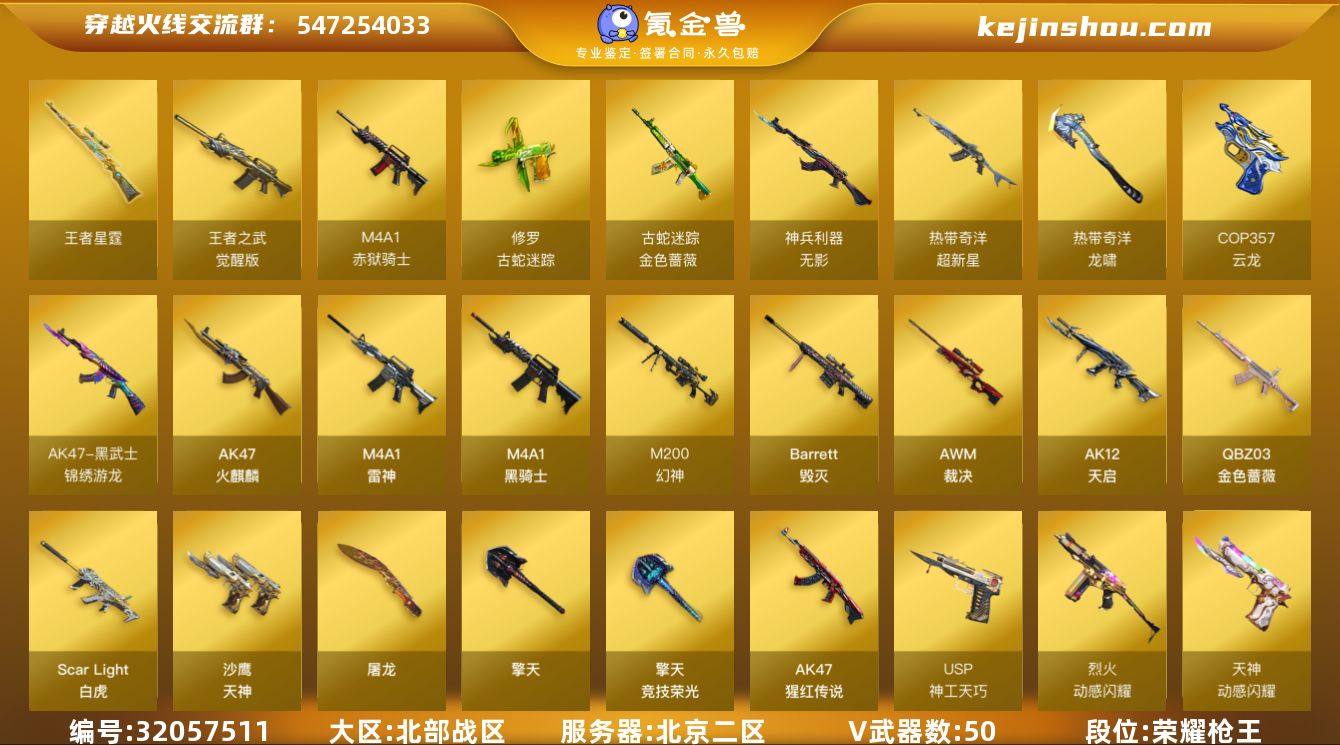 【ky4717】北京二区-53V-2王者-0炫金 【热门武器】:QBZ03-金色蔷薇,Scar Light-白虎,M4A1-青龙,M200-幻神,金色蔷薇-古蛇迷踪,修罗-古蛇迷踪,M4A1-黑骑士 【王者炫金武器】:王者星霆 【音效卡】:擎天-云海游龙音效卡,M4A1-黑骑士音效卡 【皮肤】:幻神-纸灯龙皮肤,金色蔷薇-破浪逐光 皮肤,金色蔷薇-电竞之星 皮肤,雷神-宇航兔皮肤,M4A1-雷神-新春神龙皮肤,火麒麟-平天大圣,毁灭-风暴,毁灭-虹光风暴 皮肤,毁灭-英雄计划 皮肤,黑骑士-战神马超,黑骑士-破界 皮肤,AWM-天龙-传奇白鲨,修罗耀金皮肤,屠龙-破浪逐光 皮肤 【角色】:零,战地猎狐,王者潘多拉,蛇隐宗,奇洋探员,乔伊教练,云海玲珑,电竞少女,飞虎队-X,风暴女,嘉年华灵狐,兰妹妹,猎狐者-追月,0号玩家,灵狐者-X,灵狐者-七夕宝贝,潘多拉-甜心教官,蛇姬,斯沃特-X,新娜塔莎,樱-战斗天使,游珑儿 【人偶武器】:天龙-乔伊教练,AWM-灵狐-15周年嘉年华,迷你波特博士,生化手雷-机甲核心 【挑战大师】:冰龙粉碎者-白马银枪*2,神圣爆裂者-末日III 【英雄级武器】:AK47-火麒麟,M4A1-雷神,M4A1-黑骑士,AK12-天启,M4A1-青龙,Scar Light-白虎,无影-神兵利器,黑武士-锦绣游龙,超新星-热带奇洋,金色蔷薇-古蛇迷踪,QBZ03-金色蔷薇,烈火-动感闪耀,王者之武-觉醒版,AK-47-猩红传说,Barrett-毁灭,AWM-裁决,M200-幻神,沙鹰-天神,COP 357-云龙,USP-神工天巧,天神-动感闪耀,修罗-古蛇迷踪,屠龙,擎天*3,擎天-竞技荣光,屠龙-动感闪耀,擎天-云海游龙,龙啸-热带奇洋,高爆手雷-雷霆,高爆手雷-竞技荣光,高爆手雷-神工天巧*4,手雷-动感闪耀,手雷-云海游龙,手雷-热带奇洋,高爆手雷-古蛇迷踪,闪光弹-雷霆*2,闪光弹-幻灵,闪光弹-竞技荣光,闪光弹-神工天巧*3,烟雾弹-雷霆,烟雾弹-竞技荣光,烟雾弹-神工...