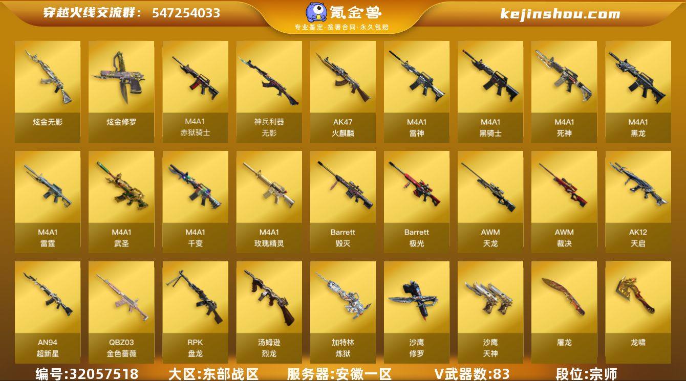 【ky3999】安徽一区-86V-2王者-2炫金 【热门武器】:QBZ03-金色蔷薇,M200-竞技荣光,死亡之眼*2,M4A1-黑骑士,汤姆逊-烈龙*6,RPK-盘龙*6,加特林-炼狱,沙鹰-修罗*6,金刚伞 【王者炫金武器】:炫金无影,炫金修罗 【音效卡】:AK47-火麒麟音效卡*2,M4A1-雷神音效卡,Barrett-毁灭音效卡,Barrett-极光音效卡 【皮肤】:雷神-能量核心,雷神-荣耀之魄,雷神-星空,火麒麟-心动糖果,毁灭-暗月,毁灭-荣耀之怒,毁灭耀金皮肤,毁灭-星空,黑龙-能量核心,黑骑士-暗月,无影-暗月,天龙-能量核心,极光-能量核心,修罗-能量核心*2,屠龙-荣耀之锋*2 【角色】:樱,炫,战地猎狐,王者之瞳,暗夜-X,初恋灵狐,风暴女,嘉年华灵狐,兰-海滩派对,零-水下丽影,潘多拉-X,斯沃特-X,铁骑荣耀,兔囡囡 【人偶武器】:AWM-灵狐-15周年嘉年华,海滩汪汪-巴雷特,生化手雷-机甲核心,迷你超能女侍,灵狐娃娃手雷 【暴走生化】:死亡之眼*2 【挑战大师】:冰龙粉碎者-白马银枪,神圣爆裂者-末日III 【英雄级武器】:M4A1-千变,AK47-火麒麟*3,M4A1-黑龙,M4A1-雷神*2,M4A1-黑骑士,M4A1-死神,AK12-天启,AN94-超新星,M4A1-武圣,M4A1-雷霆,无影-神兵利器,M4A1-玫瑰精灵,QBZ03-金色蔷薇,AK-47-猩红传说,AWM-天龙*2,Barrett-毁灭*2,Barrett-极光,AWM-裁决,M200-竞技荣光,RPK-盘龙*6,加特林-炼狱,炼狱-悦蓝-觉醒版,汤姆逊-烈龙*6,沙鹰-修罗*6,沙鹰-天神*2,COP-雷霆,屠龙*4,龙啸,擎天*2,麒麟刺,擎天-竞技荣光,高爆手雷-雷霆*7,高爆手雷-竞技荣光,闪光弹-雷霆*7,闪光弹-竞技荣光,烟雾弹-雷霆*7,烟雾弹-竞技荣光,M4A1-赤狱骑士 【道具】:云山科技背包,亚洲杯纪念炫彩背包,全能枪王背包,女皇终结者-背包,战舰背包,炫彩背包,女皇终结者-魔龙之吻,救世主-黑桃战神,黄金生化钩,绿色巨...