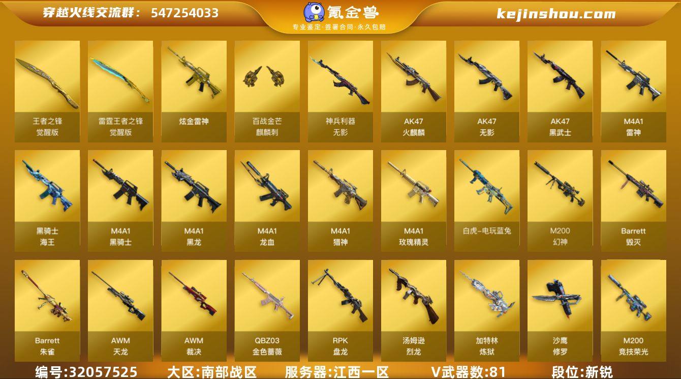 【ky5389】江西一区-87V-12王者武器数-1炫金武器数 【热门武器】:QBZ03-金色蔷薇,M200-幻神,M200-竞技荣光,荣耀世冠-雷神,白虎-电玩蓝兔,M4A1-黑骑士*4,汤姆逊-烈龙*6,RPK-盘龙*4,加特林-炼狱*2,斯泰尔-蝴蝶,羊驼玩偶,USP-雷暴,沙鹰-修罗*6,荣耀世冠-龙啸 【王者炫金武器】:炫金雷神 【音效卡】:AK47-火麒麟音效卡,M4A1-黑骑士音效卡 【皮肤】:幻神-周瑜皮肤,烈龙-星空,雷神-暗月,雷神-荣耀之魄,雷神-耀金皮肤,M4A1-再燃火线,火麒麟-战神关羽,火麒麟-心动糖果,毁灭-CFS2020,毁灭-SV-CFPLS16冠军,毁灭-英雄计划 皮肤,M4A1-千变-孔明皮肤,黑龙-冠军之武,战神-粉色甜心皮肤,战神-紫绶金章皮肤*2,AK47-B-常胜将军-曹操*2,AK47-B-常胜将军-刘备*3,AWM-天龙-传奇70KG,AWM-天龙-传奇白鲨,炼狱-星空,轻型军用手斧-再燃火线 【角色】:电竞教官-云悠悠,王者-葵-貂蝉,王者复仇,王者春,乔伊教练,炽天使,暗夜-X,北极狐-X,娟娟,灵狐者-X,灵狐者-黄金海岸,龙儿,龙儿-小淘气,曼陀罗-X,潘多拉-X,潘多拉-甜心教官,潜龙队-X,斯沃特-X,铁骑-乘风破浪,新娜塔莎,樱-战斗天使,影武者-X 【人偶武器】:斯泰尔-蝴蝶,M37-葵,夺魂,深渊终结者手雷,闪光弹-貂蝉,高爆手雷-大乔,迷你艾比,迷你超能女侍 【暴走生化】:黑龙吞噬者,超级对讲机 【挑战大师】:激光毁灭者III 【英雄级武器】:AK47-火麒麟*3,M4A1-黑龙,M4A1-雷神*4,M4A1-黑骑士*4,AK47-无影,AK47-黑武士,M4A1-龙血*2,无影-神兵利器,M4A1-玫瑰精灵,QBZ03-金色蔷薇,M4A1-猎神,AK-47-猩红传说,AK47-B-战神,黑骑士-海王,AK47-B-常胜将军*2,白虎-电玩蓝兔,荣耀世冠-雷神,AWM-天龙,Barrett-毁灭*3,AWM-裁决,M200-幻神,Barrett-朱雀,M200-竞技荣光,RPK-盘龙*4,加特林-炼狱*2,汤姆逊-烈龙*6,...