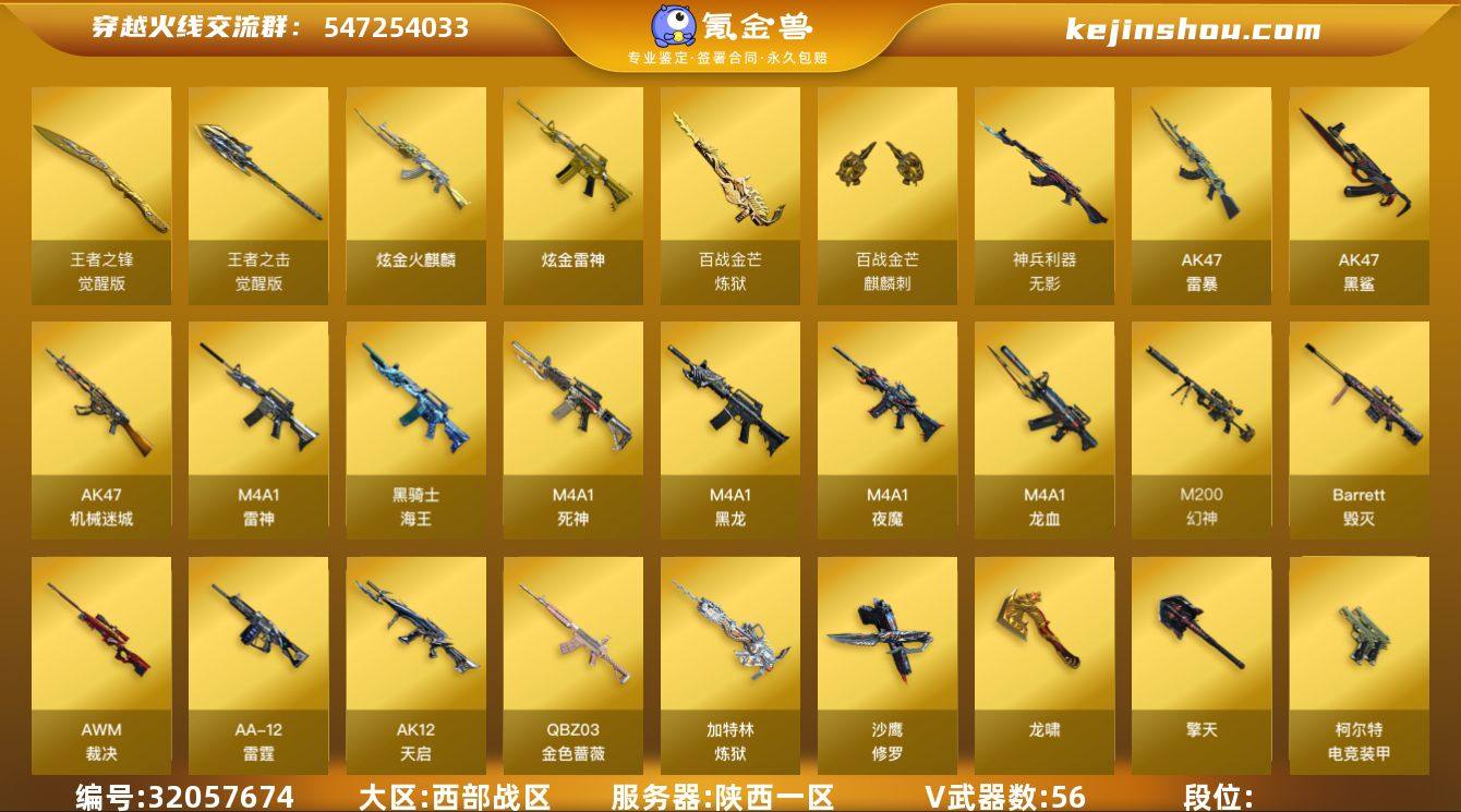 【46】56V/102级/荣耀元首/2王者/2炫金/1英雄/QBZ03-金色蔷薇/M200-幻神/加特林-炼狱/斯泰尔蝴蝶/COP-白鲨/USP雷暴/沙鹰-修罗/炫金火麒麟/炫金雷神/炼狱-百战金芒-庆典舞曲音效卡/M200-幻神-黄忠/幻神-CFS2022/M4A1-再燃火线/火麒麟-雷神/火麒麟-轻羽皮肤/毁灭-魔灵皮肤/毁灭-神秘黑洞皮肤/M4A1-千变-孔明皮肤/黑龙-墨子皮肤/黑骑士-暗月/轻型军用手斧-再燃火线/麒麟刺-月皮肤/魅影/空/暗夜-X/北极狐-X/初恋灵狐/芳心审判者/风暴女/嘉年华灵狐/娟娟/灵狐者-职业经理/潘多拉-X/铁骑荣耀/天龙-曼陀罗/AWM-灵狐-15周年嘉年华/迷你生化手雷/灵狐娃娃手雷/超级对讲机/神圣爆裂者/试炼破坏者/神圣爆裂者-末日/M4A1-黑龙/M4A1-雷神/M4A1-死神/AK12-天启/AK47-机械迷城/AK47-黑鲨/M4A1-龙血/AK47-雷暴/M4A1-夜魔/无影-神兵利器/黑骑士-海王/Barrett-毁灭/AWM-裁决/炼狱-百战金芒/AA-12-雷霆/柯尔特-电竞装甲/龙啸/擎天/斩神刀-雷暴/麒麟刺-百战金芒/王者之锋-觉醒版/王者之击-觉醒版/高爆手雷-雷暴/闪光弹-雷暴/烟雾弹-雷暴/云海游龙炫彩背包/女皇终结者-背包/百战金芒炫彩背包/虎牙炫彩背包/超级背包/女皇终结者-魔龙之吻/灵魂忍者/生化弹匣/夺命之镰/防化服/金色流光-枪王排位/星辰流光-枪王排位/枪王排位28赛季金色流光/语音特效-盛典烟火/萌萌小葵表情/斯沃特表情/C4-红龙/C4-沙漠/防弹头盔/防弹衣/C4工具钳/手雷包
