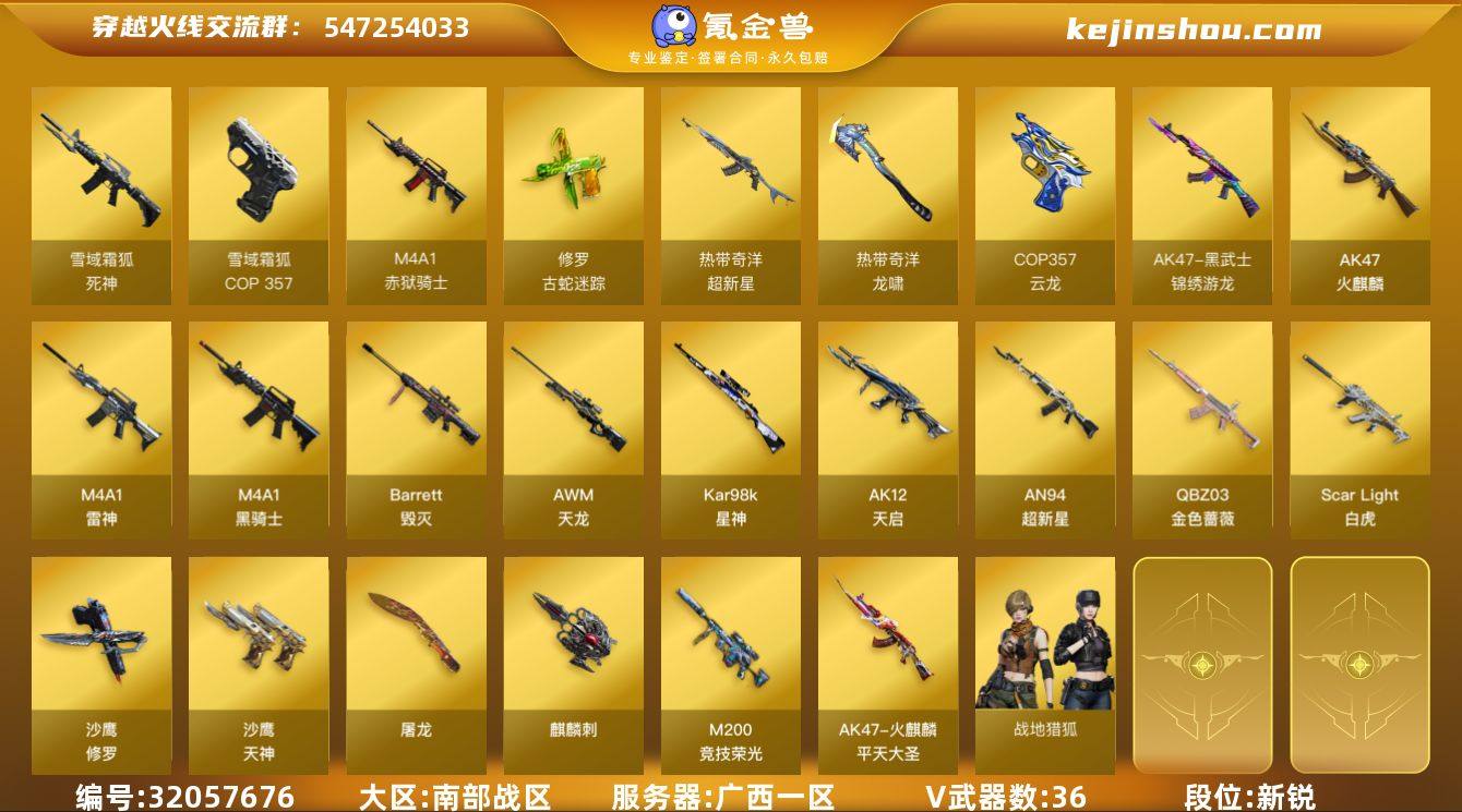 广西一区-37V-1王者-0炫金 【热门武器】:QBZ03-金色蔷薇,Scar Light-白虎,修罗-古蛇迷踪,M200-竞技荣光,死亡之眼,Kar98K-星神,M4A1-黑骑士,羊驼玩偶*2,雷神-小红,沙鹰-修罗*3 【音效卡】:Kar98K-星神音效卡,死神-雪域霜狐-怀旧音效卡,AK47-火麒麟-怀旧音效卡 【皮肤】:火麒麟-平天大圣 【角色】:战地猎狐,雪域霜狐,蛇隐宗,奇洋探员,乔伊教练,飞虎队-X,疾风,娟娟,龙儿,麻雀,娜塔莉娅,蛇姬,斯沃特-X,铁骑荣耀,雪莉杨-摸金校尉,游珑儿 【人偶武器】:雷神-小红,迷你牛牛,灵狐娃娃手雷 【暴走生化】:死亡之眼 【挑战大师】:冰龙粉碎者-白马银枪 【英雄级武器】:AK47-火麒麟,M4A1-雷神,M4A1-黑骑士,AK12-天启,AN94-超新星,Scar Light-白虎,黑武士-锦绣游龙,超新星-热带奇洋,死神-雪域霜狐,QBZ03-金色蔷薇,AWM-天龙,Barrett-毁灭,Kar98K-星神,M200-竞技荣光,沙鹰-修罗*3,沙鹰-天神*2,COP 357-云龙,COP 357-雪域霜狐,修罗-古蛇迷踪,屠龙*3,麒麟刺,龙啸-热带奇洋,高爆手雷-雷暴,高爆手雷-云龙*3,手雷-热带奇洋,高爆手雷-古蛇迷踪,闪光弹-雷暴,闪光弹-云龙*3,烟雾弹-云龙*3,烟雾弹-古蛇迷踪,M4A1-赤狱骑士 【道具】:云山科技背包,古蛇迷踪炫彩背包,奇洋探员-海龟背包,炫彩背包,热带奇洋炫彩背包,超级背包,雪域霜狐炫彩背包,女皇终结者-魔龙之吻,救世主-黑桃战神,绿色巨人,灵魂忍者*2,变异宝贝,迷雾幽灵*2,夺命之镰,防化服*3,金色流光-枪王排位,星辰流光-枪王排位,流光-鎏金之域,流光-再燃火线,枪王排位28赛季金色流光,枪王排位29赛季金色流光,古蛇迷踪打击特效,雪域霜狐表情,蛇隐宗表情,热带奇洋表情,防弹头盔*3,防弹衣*3,C4工具钳*3,手雷包*3 【特殊枪械】:1白虎,1黑骑士