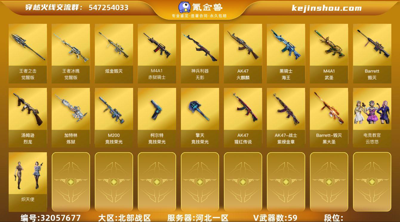 【50】59V/102级/荣耀元首/2王者/1炫金/2英雄/M200-竞技荣光/汤姆逊-烈龙/加特林-炼狱/炫金毁灭/毁灭-黑大圣皮肤/战神-紫绶金章皮肤/电竞教官-云悠悠/蛇隐宗/乔伊教练/炽天使/暗夜-X/电竞少女/风暴女/嘉年华灵狐/娟娟/兰妹妹/猎狐者-追月/0号玩家/灵狐者-黄金海岸/灵狐者-七夕宝贝/龙儿-小淘气/玫瑰花神/潘多拉-X/蛇姬/斯沃特-X/铁骑荣耀/维纳斯/新娜塔莎/雪莉杨-摸金校尉/樱-战斗天使/AWM-灵狐-15周年嘉年华/迷你裂空之翼/迷你牛牛/生化手雷-机甲核心/深渊终结者手雷/灵狐娃娃手雷/超级对讲机/神圣爆裂者/冰龙粉碎者-白马银枪/激光毁灭者III-白马银枪/VEPR-12-金魔/激光毁灭者/神圣爆裂者-末日/阐释者/AK47-火麒麟/M4A1-武圣/无影-神兵利器/AK-47-猩红传说/王者冰魄-觉醒版/黑骑士-海王/Barrett-毁灭/柯尔特-竞技荣光/擎天-竞技荣光/王者之击-觉醒版/高爆手雷-幻灵/高爆手雷-竞技荣光/闪光弹-竞技荣光/烟雾弹-幻灵/烟雾弹-竞技荣光/烟雾弹-古蛇迷踪/M4A1-赤狱骑士/CFS限定背包/云山科技背包/战舰背包/超级背包/女皇终结者-魔龙之吻/救世主-黑桃战神/绿色巨人/灵魂忍者/迷雾幽灵/夺命之镰/防化服/金色流光-枪王排位/枪王排位28赛季金色流光/枪王排位29赛季金色流光/EP战队名片/EP战队喷图/防弹头盔/防弹衣/C4工具钳/手雷包