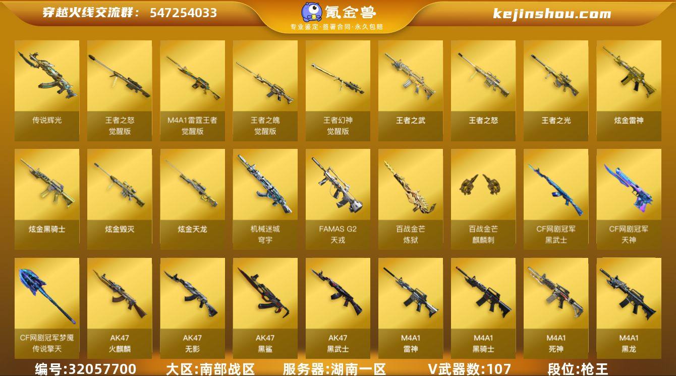 【ky6116】湖南一区-116V-7王者武器数-5炫金武器数 【传说武器】:传说辉光 【热门武器】:传说辉光,QBZ03-金色蔷薇*2,M200-幻神,M200-竞技荣光,死亡之眼,白虎-电玩蓝兔,C.A.T,M4A1-黑骑士*2,汤姆逊-烈龙*6,RPK-盘龙*2,加特林-炼狱*5,沙鹰-修罗*3 【王者炫金武器】:王者之武,王者之光,王者之怒,炫金骑士,炫金雷神,炫金毁灭*2,炫金天龙 【音效卡】:Barrett-碧霄极光音效卡,炼狱-百战金芒-庆典舞曲音效卡 【皮肤】:幻神-电竞之星 皮肤,裁决-过载 皮肤,裁决-胜者为王 皮肤,雷神-能量核心,雷神-荣耀之魄,M4A1-雷神-CFS 2019,M4A1-再燃火线,雷神-神秘按键 皮肤,火麒麟-百城,毁灭-星空,毁灭-虹光风暴 皮肤,毁灭-英雄计划 皮肤,无影-能量核心,战神-粉色甜心皮肤*2,战神-紫绶金章皮肤*7,战神-流金岁月皮肤*5,AK47-B-常胜将军-曹操,AK47-B-常胜将军-刘备*2,极光-能量核心,轻型军用手斧-再燃火线 【角色】:零,迷迭香,电竞教官-云悠悠,零·纪元,王者-葵-貂蝉,王者玲珑,乔伊教练,修道士,云海玲珑,葵-阿尔法武装,空,暗夜-X,初恋灵狐,芳心审判者,娟娟,兰-海滩派对,兰妹妹,灵动武士,灵狐者-黄金海岸,龙儿,潘多拉-甜心教官,铁骑-乘风破浪,雪莉杨-摸金校尉,影武者-X 【人偶武器】:天龙-曼陀罗,火麒麟-灵狐,AWM-灵狐-15周年嘉年华,C.A.T,迷你深渊冰龙,迷你波特博士*6,迷你曼提柯尔,夺魂*3,迷你牛牛,迷你火种*2,迷你生化手雷,闪光弹-小乔,迷你超能女侍 【暴走生化】:死亡之眼,超级对讲机 【挑战大师】:试炼破坏者III,KAC-圣炎切割者III,阐释者III 【英雄级武器】:AK47-火麒麟,M4A1-黑龙*2,M4A1-雷神,M4A1-黑骑士*2,AK47-无影,M4A1-死神,AK47-黑武士*2,AK47-黑鲨*2,M4A1-龙血,FAMAS G2-天戎,M4A1-玫瑰精灵,QBZ03-金色蔷薇*2,9A91-烈火...