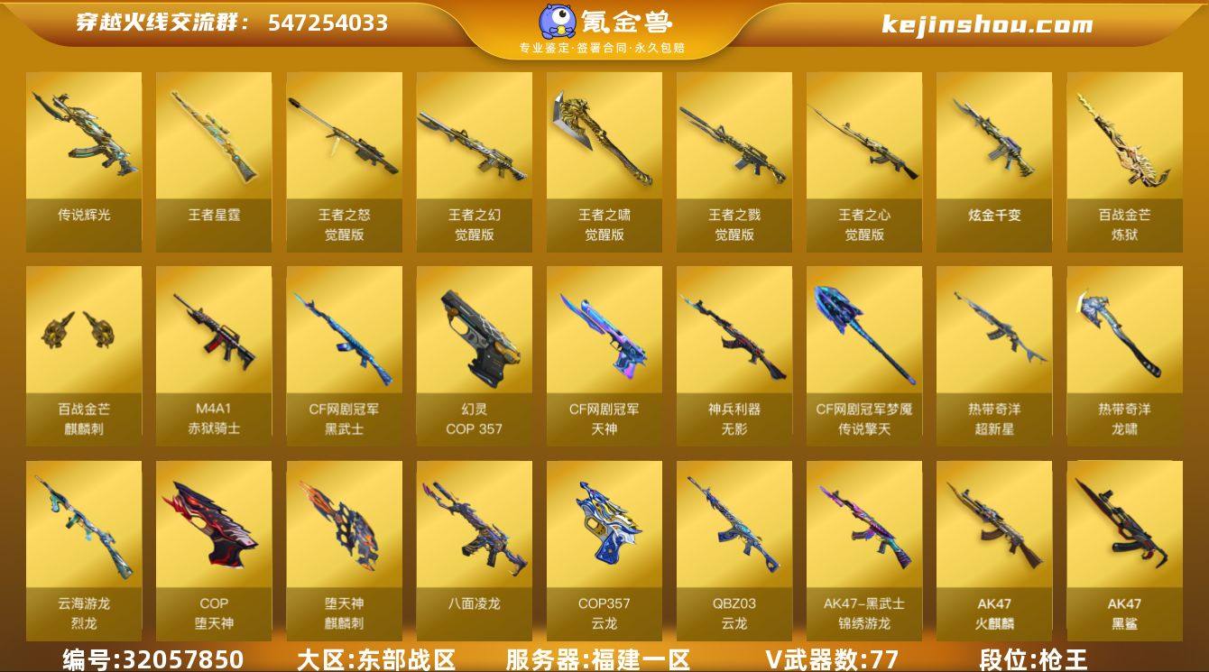 【ky4598】福建一区-82V-12王者-1炫金 【传说武器】:传说辉光 【热门武器】:传说辉光,QBZ03-金色蔷薇,Scar Light-白虎,M200-幻神*2,八面凌龙,M4A1-黑骑士,COP-堕天神,COP 357-幻灵,沙鹰-修罗,柯尔特-赛博朋克 【王者炫金武器】:王者星霆,炫金千变 【音效卡】:烈火-动感闪耀 音效卡,擎天-云海游龙音效卡,屠龙-云海游龙音效卡,AN94-超新星-热带奇洋音效卡,M4A1-雷神音效卡,M4A1-黑龙音效卡,M4A1-黑骑士音效卡,Scar Light-白虎音效卡,炼狱-百战金芒-庆典舞曲音效卡 【皮肤】:幻神-丹凤,金色蔷薇-电竞之星 皮肤,雷神-暗月,雷神-虎将,雷神-烈虎皮肤,雷神-机甲刑天皮肤,雷神-宇航兔皮肤,雷神-云海游龙皮肤,雷神-诺拉 皮肤,M4A1-再燃火线,火麒麟-AG战队皮肤,火麒麟-华夏之心,火麒麟-百城,火麒麟-心动糖果,毁灭-战神张飞,毁灭-黑大圣皮肤,黑龙-暗月,黑骑士-暗月,黑骑士耀金皮肤,黑骑士-破浪10年皮肤,玫瑰精灵-粉色浪漫 皮肤,战神-粉色甜心皮肤,AK47-B-常胜将军-曹操,AK47-B-常胜将军-刘备,AK47-B-常胜将军-孙权,天龙-能量核心,屠龙-荣耀之锋,屠龙-星火燎原,轻型军用手斧-再燃火线 【角色】:晴雅,隼,审判者,王者涂鸦,王者潘多拉,奇洋探员,乔伊教练,云海玲珑,暗夜-X,北极狐-X,初恋灵狐,电竞少女,飞虎队-X,风暴女*2,虎妞,嘉年华灵狐,疾风,娟娟,灵狐者-X,灵狐者-七夕宝贝,龙儿-小淘气,麻雀,娜塔莉娅,潘多拉-X,潘多拉-甜心教官,青霞仙子,斯沃特-X,蜀雪,铁骑荣耀,兔囡囡,维纳斯,五号兵器-赛博朋克,新娜塔莎,雪莉杨-摸金校尉,夜玫瑰-宠粉,樱-战斗天使,游珑儿 【人偶武器】:天龙-曼陀罗,M4A1-雷神-精英刀锋,AWM-灵狐-15周年嘉年华*2,COP-旗袍,迷你裂空之翼,迷你波特博士,夺魂,迷你牛牛*2,深渊终结者手雷*2,闪光弹-小乔,闪光...