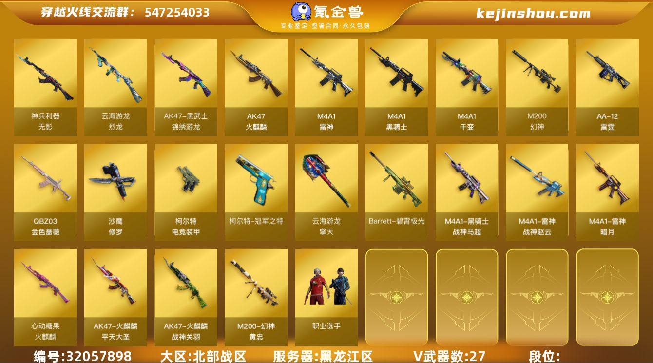 【44】27V/100级/尉官/1王者/QBZ03-金色蔷薇/M200-幻神/柯尔特-冠军之特/M4A1-黑骑士/沙鹰-修罗/王者玄武/修罗-云海游龙音效卡/M4A1-黑骑士音效卡/绝迹语音包/Barrett-碧霄极光音效卡/M200-幻神-黄忠/雷神-暗月/M4A1-战神赵云/雷神-神秘按键 皮肤/火麒麟-战神关羽/火麒麟-平天大圣/火麒麟-心动糖果/毁灭-魔灵皮肤/黑骑士-战神马超/奇洋探员/乔伊教练/修道士/云海玲珑/暗夜-X/芳心审判者/飞虎队-X/风暴女/灵狐者-X/龙儿/曼陀罗-X/曼陀罗-礼服/潘多拉-X/斯沃特-X/蜀雪/兔囡囡/维纳斯/雪莉杨/夜玫瑰-宠粉/樱-战斗天使/职业选手/AWM-灵狐-15周年嘉年华/迷你裂空之翼/迷你牛牛/迷你火种/灵狐娃娃手雷/激光毁灭者III-白马银枪/M4A1-千变/AK47-火麒麟/M4A1-雷神/无影-神兵利器/AK47-黑武士-锦绣游龙/王者玄武-觉醒版/烈龙-云海游龙/AA-12-雷霆/柯尔特-电竞装甲/擎天-云海游龙/丛林匕首-玄豹/手雷-云海游龙/高爆手雷-玄豹/闪光弹-玄豹/烟雾弹-玄豹/Barrett-碧霄极光/AG战队炫彩背包/BS战队炫彩背包/云山科技背包/云海游龙炫彩背包/炫彩背包-诺拉/女皇终结者-魔龙之吻/绿色巨人/灵魂忍者/变异宝贝/迷雾幽灵/夺命之镰/防化服/金色流光-枪王排位/流光-鎏金之域/枪王排位28赛季金色流光/云海游龙表情/防弹头盔/防弹衣/C4工具钳/手雷包