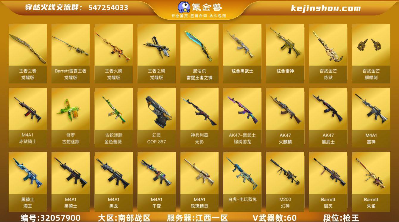 【ky4838】江西一区-64V-10王者-2炫金 【热门武器】:QBZ03-金色蔷薇,M14EBR-玄武,M200-幻神,金色蔷薇-古蛇迷踪,修罗-古蛇迷踪,白虎-电玩蓝兔,金色小号,牛牛-AK47,M4A1-黑骑士,羊驼玩偶,COP-白鲨,COP 357-幻灵,沙鹰-修罗*2 【王者炫金武器】:雷霆王者之锋,炫金雷神,炫金武士,王者之魄高爆手雷,王者之魄闪光弹 【音效卡】:M200-幻神音效卡,M4A1-雷神音效卡,M4A1-黑骑士音效卡,Barrett-碧霄极光音效卡*2,炼狱-百战金芒-庆典舞曲音效卡 【皮肤】:幻神-降龙,幻神-荣耀世冠白鲨2023 皮肤,幻神-电竞之星 皮肤,金色蔷薇-热带奇洋 皮肤,QBZ03-荣耀世冠EP 皮肤,裁决-叶芒苍灵 皮肤,雷神-虎将,雷神-动感闪耀 皮肤,雷神-源计划2.0专属 皮肤,雷神-春花弄影 皮肤,M4A1-再燃火线,火麒麟-轻羽皮肤,毁灭-黑大圣皮肤,毁灭-风暴,毁灭-英雄计划 皮肤,黑龙-墨子皮肤,黑骑士-暗月,黑骑士-冠军之势,黑骑士-电玩青兔皮肤,战神-粉色甜心皮肤,轻型军用手斧-再燃火线,麒麟刺-月皮肤 【角色】:葵,晴雅,王者零-华冠丽服,王者炫,王者影豹,蛇隐宗,奇洋探员,乔伊教练,修道士,炽天使,飞虎队-X,风暴女,虎妞,嘉年华灵狐,葵-赛博朋克,灵狐者-X,女主播,潘多拉-甜心教官,青霞仙子,蛇姬,兔囡囡,雪莉杨,游珑儿 【人偶武器】:COP-白鲨,M4A1-雷神-精英刀锋,AWM-灵狐-15周年嘉年华,COP-旗袍,牛牛-AK47,迷你牛牛,迷你超能女侍 【挑战大师】:冰龙粉碎者-白马银枪,VEPR-12-金魔,激光毁灭者III,神圣爆裂者-末日III 【英雄级武器】:M4A1-千变,AK47-火麒麟,M4A1-黑龙,M4A1-雷神*2,M4A1-黑骑士,AK47-黑武士,AN94-超新星,M14EBR-玄武,QBZ03-天罚,无影-神兵利器,黑武士-锦绣游龙,金色蔷薇-古蛇迷踪,M4A1-玫瑰精灵,QBZ03-金色蔷薇,烈火-动感闪耀,AK-47-猩红传说,AK47-...