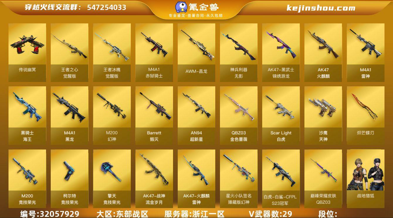 【4】29V/101级/大元首/1传说/2王者/1英雄/传说幽冥/QBZ03-金色蔷薇/Scar Light-白虎/M200-幻神/M200-竞技荣光/炽芒蝶刃/M200-幻神音效卡/白虎音效卡/白鲨语音包/AWM-昌龙-怀旧音效卡/幻神-星火小队签名臻藏版/白虎-白鲨-CFPLS23冠军/QBZ03-巅峰荣耀皮肤/裁决-巅峰荣耀 皮肤/火麒麟-雷神/毁灭-百城浙江 皮肤/战神-流金岁月皮肤/战地猎狐/乔伊教练/修道士/电竞少女/飞虎队-X/风暴女/嘉年华灵狐/灵狐者-X/龙儿-小淘气/麻雀/潘多拉-甜心教官/青霞仙子/斯沃特-X/蜀雪/新娜塔莎/雪莉杨-摸金校尉/影武者-X/游珑儿/职业选手/Scar Light-马枪/AWM-灵狐-15周年嘉年华/迷你裂空之翼/超级对讲机/AK47-火麒麟/M4A1-黑龙/M4A1-雷神/AN94-超新星/无影-神兵利器/AK47-黑武士-锦绣游龙/王者之心-觉醒版/王者冰魄-觉醒版/黑骑士-海王/Barrett-毁灭/沙鹰-天神/COP-雷霆/柯尔特-竞技荣光/擎天-竞技荣光/高爆手雷-竞技荣光/闪光弹-雷暴/闪光弹-竞技荣光/烟雾弹-竞技荣光/M4A1-赤狱骑士/AWM-昌龙/CFS限定背包/炫彩背包/超级背包/救世主-黑桃战神/绿色巨人/灵魂忍者/迷雾幽灵/夺命之镰/防化服/金色流光-枪王排位/流光-鎏金之域/流光-再燃火线/枪王排位28赛季金色流光/枪王排位29赛季金色流光/EP战队名片/EP战队喷图/C4-再燃火线/防弹头盔/防弹衣/C4工具钳/手雷包