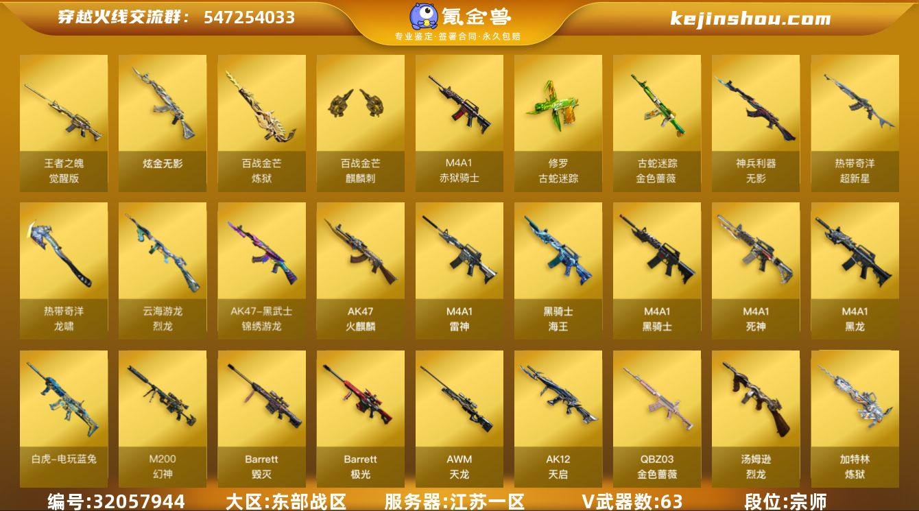 【ky5128】江苏一区-69V-2王者-1炫金 【传说角色】:传说影煞 【热门武器】:QBZ03-金色蔷薇,M200-幻神,金色蔷薇-古蛇迷踪,修罗-古蛇迷踪,死亡之眼,白虎-电玩蓝兔,Cat-刀锋,毒蜂,牛牛-AK47,M4A1-黑骑士,汤姆逊-烈龙,加特林-炼狱,沙鹰-修罗,金刚伞 【王者炫金武器】:炫金无影 【音效卡】:M4A1-雷神音效卡,M4A1-黑骑士音效卡,炼狱-百战金芒-庆典舞曲音效卡,沙鹰-修罗-盛典舞曲音效卡,柯尔特-百战金芒-庆典舞曲音效卡 【皮肤】:幻神-纸灯龙皮肤,雷神-暗月,雷神-宇航兔皮肤,雷神-源计划2.0专属 皮肤,M4A1-再燃火线,雷神-神秘按键 皮肤,火麒麟-雷神,火麒麟-大唐荣光,火麒麟-心动糖果,毁灭-黑大圣皮肤,毁灭-英雄计划 皮肤,M4A1-千变-孔明皮肤,黑龙-能量核心,战神-粉色甜心皮肤,战神-紫绶金章皮肤*5,战神-流金岁月皮肤*2,AK47-B-常胜将军-孙权,修罗-冠军之魂,天神-宇航兔皮肤,屠龙-春桃 皮肤,轻型军用手斧-再燃火线,擎天-秘银 【角色】:零,葵,枪娘樱,战地猎狐,王者零-华冠丽服,王者炽天使,蛇隐宗,奇洋探员,乔伊教练,修道士,云海玲珑,暗夜-X,北极狐-X,电竞少女,芳心审判者,飞虎队-X,风暴女,虎妞,嘉年华灵狐,娟娟,兰妹妹,0号玩家,零-水下丽影,灵狐-花神,灵狐者-X,灵狐者-黄金海岸,灵狐者-七夕宝贝,龙儿,龙儿-小淘气,麻雀,曼陀罗-X,萌儿,潘多拉-X,潘多拉-甜心教官,邱刚敖,青霞仙子,蛇姬,斯沃特-X,蜀雪,铁骑荣耀,兔囡囡,新娜塔莎,雪莉杨-摸金校尉,夜玫瑰-幻能朋克,影武者-X,游珑儿,海豹突击队 【人偶武器】:天龙-曼陀罗,迷你律动酷熊,加特林-机械猎手,AWM-灵狐-15周年嘉年华*2,M37-葵,COP-旗袍,Cat-刀锋,牛牛-AK47,迷你深渊冰龙,迷你裂空之翼*2,迷你牛魔王,迷你波特博士*2,夺魂*4,迷你牛牛,迷你火种*2,迷你生化手...