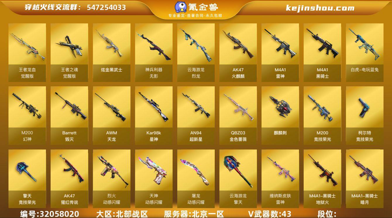 【26】43V/100级/元帅/6王者/1炫金/QBZ03-金色蔷薇/M200-幻神/M200-竞技荣光/白虎-电玩蓝兔/Kar98k-星神/M4A1-黑骑士/USP雷暴/炫金黑武士/王者之魄高爆手雷/王者之魄闪光弹/王者之魄烟雾弹/M4A1-黑骑士音效卡/金色蔷薇音效卡/幻神-电流骇客/雷神-暗月/雷神-烈虎皮肤/雷神-宇航兔/雷神-维纳斯皮肤/火麒麟-百城/火麒麟-心动糖果/毁灭耀金皮肤/毁灭-黑大圣皮肤/毁灭-神秘黑洞皮肤/毁灭-直播专属/黑骑士-暗月/黑骑士-地狱火/战神-粉色甜心皮肤/战神-紫绶金章皮肤/战神-流金岁月皮肤/AK47-B-常胜将军-曹操/麒麟刺-萌杀皮肤/火麒麟-灵狐/AWM-灵狐-15周年嘉年华/COP-旗袍/迷你深渊冰龙/迷你波特博士/夺魂/迷你火种/迷你艾比/迷你超能女侍/迷你巨石泰坦-魔花研究所/超级对讲机/冰龙粉碎者-白马银枪/激光毁灭者III-白马银枪/激光毁灭者/试炼破坏者/神圣爆裂者-末日/AK47-火麒麟/M4A1-雷神/AN94-超新星/无影-神兵利器/烈火-动感闪耀/AK-47-猩红传说/王者龙血-觉醒版/AWM-天龙/Barrett-毁灭/烈龙-云海游龙/柯尔特-竞技荣光/王者之魂-觉醒版/天神-动感闪耀/麒麟刺/擎天-竞技荣光/屠龙-动感闪耀/擎天-云海游龙/高爆手雷-竞技荣光/手雷-动感闪耀/手雷-云海游龙/闪光弹-竞技荣光/烟雾弹-竞技荣光/AG战队炫彩背包/云海游龙炫彩背包/全能枪王背包/炫彩背包/超级背包/夺命之镰/防化服/金色流光-枪王排位/星辰流光-枪王排位/电玩兔兔表情/动感闪耀表情/云海游龙表情/EP战队名片/防弹头盔/防弹衣/C4工具钳/手雷包