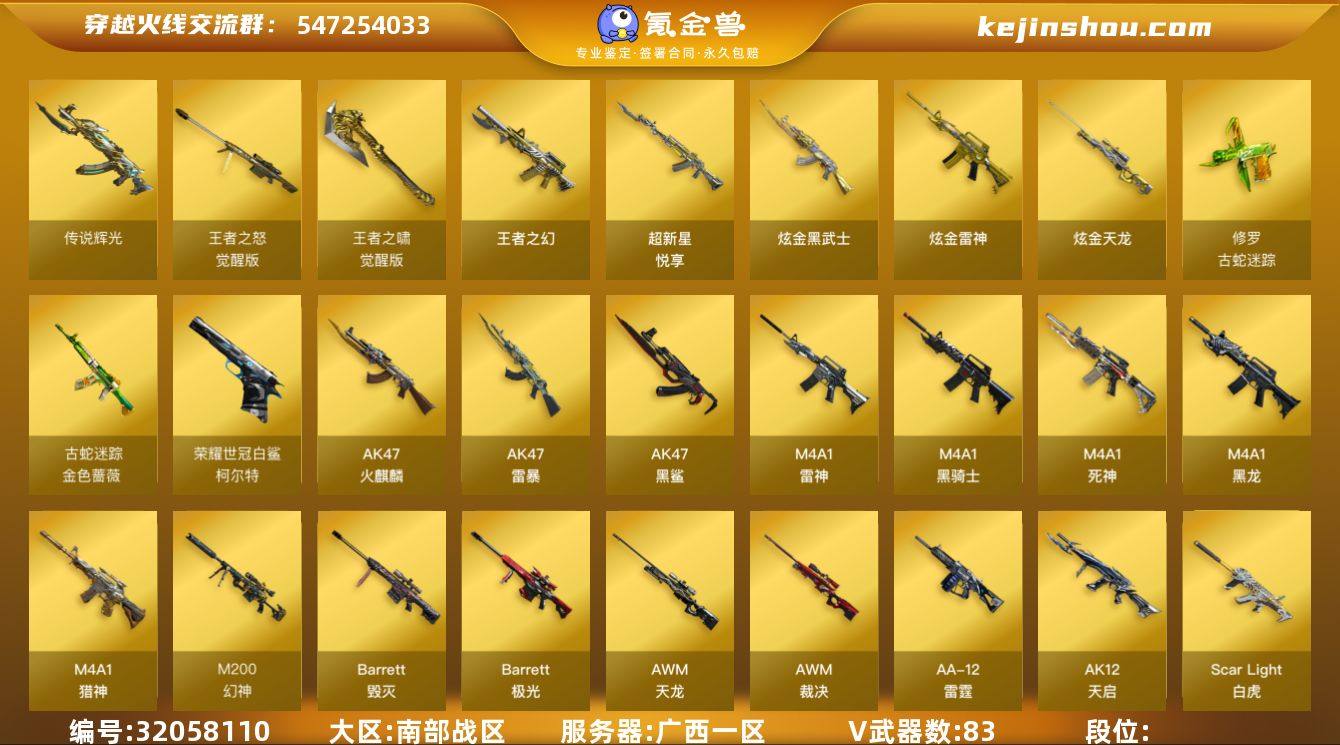【1】83V/102级/荣耀元首/1传说/4王者/3炫金/7英雄/传说辉光/传说星骇/G36C-幻影/Scar Light-白虎/M200-幻神/柯尔特-荣耀世冠白鲨2023/金色蔷薇-古蛇迷踪/修罗-古蛇迷踪/死亡之眼/柯尔特-冠军之特/M4A1-黑骑士/汤姆逊-烈龙/RPK-盘龙/加特林-炼狱/斯泰尔蝴蝶/USP雷暴/沙鹰-修罗/炽芒蝶刃- 荣耀世冠白鲨2023/超新星-悦享/王者之幻/炫金雷神/炫金黑武士/炫金天龙/M200-幻神音效卡/M4A1-黑骑士音效卡/幻神-荣耀世冠白鲨 2023/QBZ03-传奇宠儿/金色蔷薇-破浪逐光/雷神-暗月/雷神-能量核心/雷神荣耀之魄/火麒麟-冠军之心/毁灭-暗月/毁灭-荣耀之怒/毁灭-星耀 皮肤/黑龙-能量核心/无影-暗月/天龙-秘银/AWM-天龙-传奇白鲨/极光-能量核心/炼狱-星空/修罗-能量核心/天神-暗月/屠龙-荣耀之锋/屠龙-星耀 皮肤/擎天-蒸汽钟表/麒麟刺-荣耀世冠白鲨/葵/瞳/春/月兔特工/晴雅/王者-魅影/王者救世主/王者潘多拉/蛇隐宗/乔伊教练/修道士/云海玲珑/炽天使/零-水下丽影/灵狐者-X/灵狐者-黄金海岸/蛇姬/铁骑荣耀/新娜塔莎/影武者-X/海豹突击队/天龙-曼陀罗/Scar Light-马枪/迷你生化手雷/迷你超能女侍/超级对讲机/5盘龙/神圣爆裂者/冰龙粉碎者-白马银枪/激光毁灭者/AK47-火麒麟/M4A1-黑龙/M4A1-雷神/M4A1-死神/AK12-天启/AK47-黑鲨/AK47-雷暴/M4A1-猎神/AWM-天龙/Barrett-毁灭/Barrett-极光/AWM-裁决/王者之怒-觉醒版/AA-12-雷霆/沙鹰-天神/屠龙/龙啸/擎天/麒麟刺/擎天-竞技荣光/斩神刀-雷暴/王者之啸-觉醒版/丛林匕首-玄豹/高爆手雷-雷霆/高爆手雷-雷暴/高爆手雷-古蛇迷踪/闪光弹-雷暴/烟雾弹-雷暴/烟雾弹-竞技荣光/烟雾弹-古蛇迷踪/烟雾弹-玄豹/BS战队炫彩背包/CFS限定背包/KZ战队炫彩背包/亚洲杯纪念炫彩背包/古蛇迷踪炫彩背包/战舰背包/炫彩背包/超级背包/女皇终结者-魔龙之吻/绿色巨人/灵魂忍者/变异宝贝/迷雾幽灵/夺命之镰/防化服/枪...