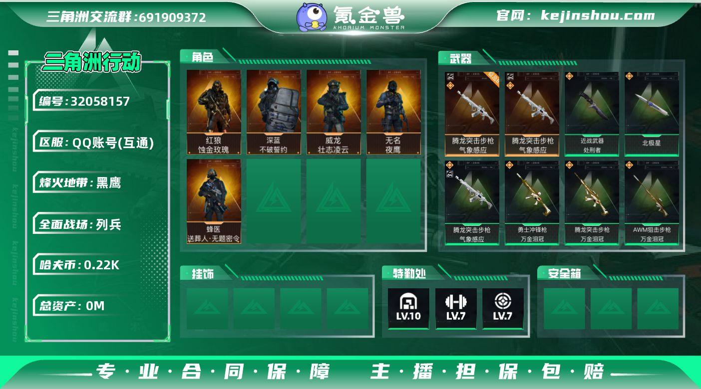 tx1471 总资产333M 烽火等级60级 天才少年徽章 守信不渝称号 S7赛季巅峰战神 腾龙突击步枪-气象感应(极品B,冰龙属性) 红狼饰金玫瑰捆绑包 北极星捆绑包 处刑者单刀皮 万金泪冠捆绑包 缄花捆绑包 缄默情歌捆绑包 鹅鸭杀捆绑包 捞点薯条捆绑包 特斯拉线圈捆绑包 M7-禁卫 (水墨云图差3发保底)S8赛季3x3箱子 特勤处满级(潜水1收藏1) 部门满级 S3S4S5S6赛季通行证 威龙-壮志凌云 无名-夜鹰 蜂医-送葬人 深蓝-不破誓约 100发AWM子弹 收藏室有红 225M纯币 (可二次实名,三角洲0违规记录)