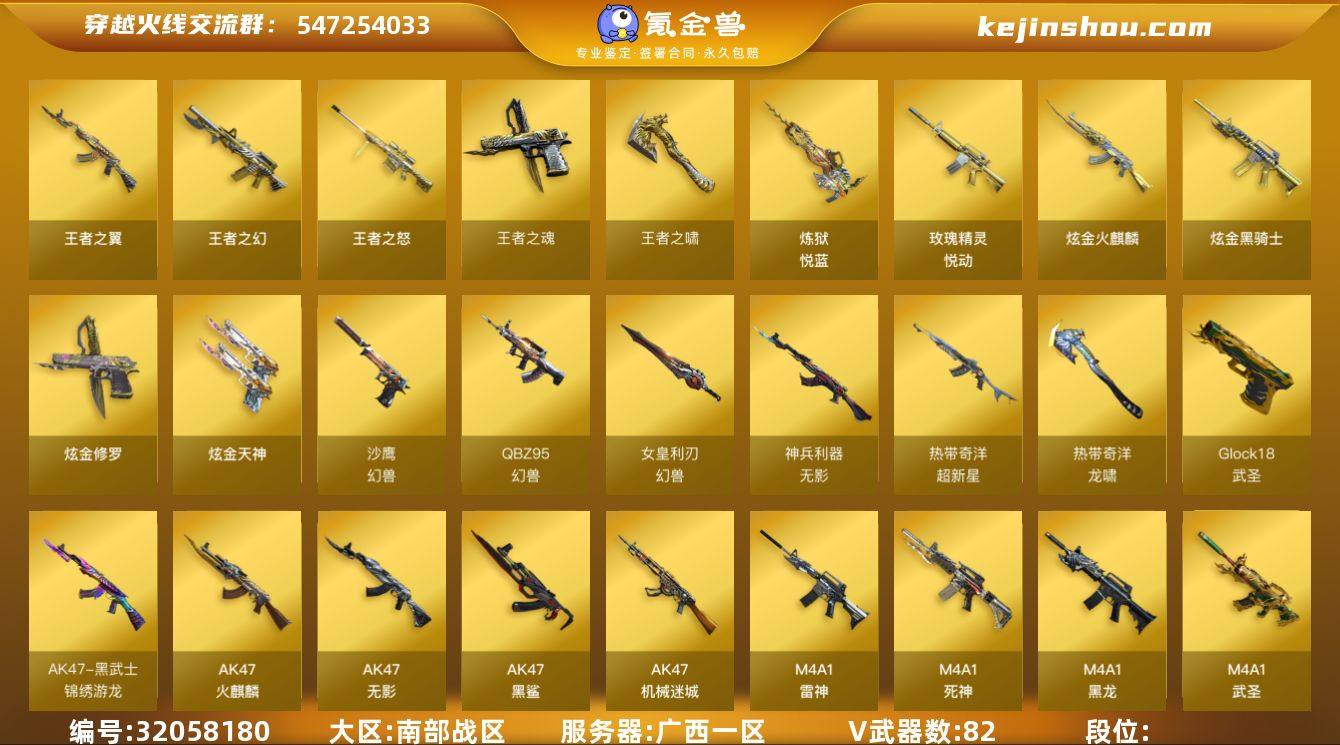 【11】82V/96级/将帅/9王者/5炫金/2英雄/QBZ03-金色蔷薇/M200-竞技荣光/死亡之眼/汤姆逊-烈龙/RPK-盘龙/加特林-炼狱/沙鹰-修罗/高爆手雷-幻兽/王者之幻/王者之翼/玫瑰精灵-悦动/王者之怒/炼狱-悦蓝/王者之魂/王者之啸/炫金火麒麟/炫金黑骑士/炫金天神/炫金修罗/M4A1-雷神音效卡/雷神-暗月/雷神-虎将/火麒麟-雷神/火麒麟-轻羽皮肤/毁灭-秦师 皮肤/黑龙-能量核心/黑龙-暗月/无影-暗月/无影-能量核心/死神-秘银/天启-暗月/天龙-秘银/极光-能量核心/修罗-能量核心/修罗-星空/天神-暗月/零/樱/王者王力宏/狐影/奇洋探员/嘉年华灵狐/潜龙队-X/斯沃特-X/天龙-曼陀罗/火麒麟-灵狐/M4A1-雷神-精英刀锋/AWM-灵狐-15周年嘉年华/迷你牛牛/生化手雷-机甲核心/灵狐娃娃手雷/黑龙吞噬者/超级对讲机/6烈龙/激光毁灭者/试炼破坏者/神圣爆裂者-末日/M4A1-千变/AK47-火麒麟/M4A1-黑龙/M4A1-雷神/AK47-无影/M4A1-死神/AK12-天启/AN94-超新星/M4A1-武圣/AK47-机械迷城/AK47-黑鲨/无影-神兵利器/AK47-黑武士-锦绣游龙/超新星-热带奇洋/M4A1-玫瑰精灵/QBZ95-幻兽/M4A1-猎神/天启-悦智-觉醒版/超新星-悦享-觉醒版/AWM-天龙/Barrett-毁灭/Barrett-极光/AWM-裁决/Barrett-金色蔷薇/AA-12-雷霆/沙鹰-天神/柯尔特-竞技荣光/沙鹰-幻兽/Glock18-武圣/屠龙/龙啸/擎天/麒麟刺/擎天-竞技荣光/龙啸-热带奇洋/女皇利刃-幻兽/高爆手雷-竞技荣光/手雷-热带奇洋/闪光弹-幻兽/闪光弹-竞技荣光/烟雾弹-幻兽/烟雾弹-竞技荣光/奇洋探员-海龟背包/战舰背包/炫彩背包/热带奇洋炫彩背包/白狐背包/超级背包/女皇终结者-魔龙之吻/救世主-黑桃战神/妩媚妖姬/绿色巨人/灵魂忍者/变异宝贝/迷雾幽灵/生化弹匣/夺命之镰/防化服/枪王排位28赛季金色流光/枪王排位29赛季金色流光/语音特效-热带奇洋/热带奇洋表情/斯沃特表情/防弹头盔/防弹衣/C4工具钳/手雷包