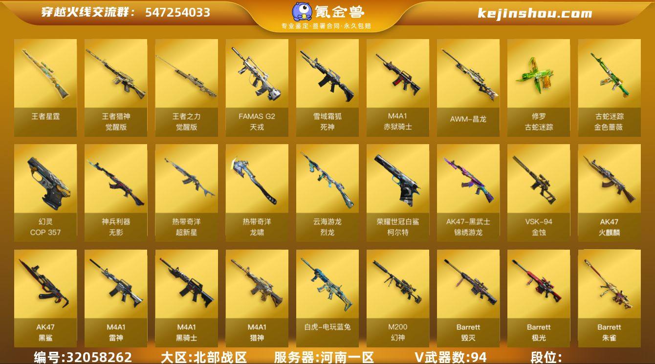 【62】94V/102级/荣耀元首/4王者/10英雄/传说星骇/G36C-幻影/QBZ03-金色蔷薇/M14EBR-玄武/M200-幻神/柯尔特-荣耀世冠白鲨2023/金色蔷薇-古蛇迷踪/修罗-古蛇迷踪/白虎-电玩蓝兔/柯尔特-冠军之特/柯尔特-荣耀世冠/Kar98k-星神/炼狱-迷你小钢/M4A1-黑骑士/加特林-炼狱/羊驼玩偶/雷神-小红/COP 357-幻灵/沙鹰-修罗/炽芒蝶刃/炽芒蝶刃- 荣耀世冠白鲨2023/黄金猫猫手套-白鲨/金刚伞/王者星霆/QBZ03-金色蔷薇-热带奇洋音效卡/M200-幻神音效卡/M4A1-雷神音效卡/Barrett-毁灭音效卡/Barrett-极光音效卡/金色蔷薇音效卡/AWM-裁决音效卡/星神音效卡/加特林-炼狱音效卡/死神-雪域霜狐-怀旧音效卡/AWM-昌龙-怀旧音效卡/M200-幻神-黄忠/幻神-宠儿/幻神-CFS2022/幻神-电流骇客/幻神-星火小队签名臻藏版/QBZ03-荣耀世冠白鲨/裁决-流光秘银/裁决-巅峰荣耀 皮肤/星神-巅峰荣耀/烈龙-星空/雷神-暗月/雷神-虎将/雷神-宠儿-2019MVP/火麒麟-巅峰荣耀/毁灭耀金皮肤/毁灭-星空/毁灭-冠军之怒/M4A1-黑龙-361/黑骑士-地狱火/黑武士-典韦皮肤/超新星-兔兔战士 皮肤/幻影-破浪逐光 皮肤/战神-紫绶金章皮肤/战神-流金岁月皮肤/AK47-B-常胜将军-曹操/AK47-B-常胜将军-刘备/AWM-再燃火线/极光-能量核心/修罗-星空/屠龙-荣耀之锋/屠龙-星火燎原/屠龙-星耀 皮肤/龙啸-冠军之啸/魅影/电竞教官-云悠悠/岚兮儿/机械姬/隐/审判者/战地猎狐/王者影豹/王者潘多拉/雪域霜狐/蛇隐宗/奇洋探员/乔伊教练/修道士/云海玲珑/空/暗夜-X/初恋灵狐/芳心审判者/嘉年华灵狐/0号玩家/灵狐-花神/灵狐者-X/麻雀/曼陀罗-X/潘多拉-X/潘多拉-甜心教官/蛇姬/斯沃特-X/铁骑荣耀/兔囡囡/幽/职业选手/巴雷特-零-水下丽影/Scar Light-马枪/AWM-灵狐-15周年嘉年华/黄金迷你深渊冰龙/迷你深渊冰龙/迷你裂空之翼/迷你波特博士/迷你曼提柯尔/夺魂/迷你火种/深渊终结者手雷/闪光弹-貂蝉...