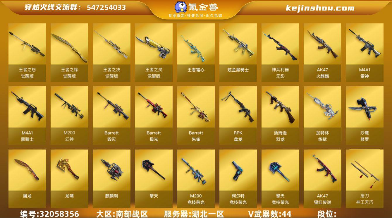 【34】44V/102级/荣耀元首/6王者/1炫金/3英雄/M200-幻神/M200-竞技荣光/死亡之眼/毒蜂/M4A1-黑骑士/汤姆逊-烈龙/RPK-盘龙/加特林-炼狱/斯泰尔蝴蝶/炼狱泡泡象/沙鹰-修罗/黄金猫猫手套-白鲨/蝴蝶斯泰尔+6烈龙/王者霜心/炫金黑骑士/屠龙动感闪耀音效卡/Barrett-毁灭音效卡/Barrett-极光音效卡/白鲨语音包/火线妹语音包/M200-幻神-黄忠/M200-幻神-荣耀世冠白鲨/烈龙-星空/雷神-虎将/雷神-耀金皮肤/雷神-宇航兔/火麒麟-华夏之心/毁灭-星空/毁灭-冠军之怒/毁灭-战神张飞/M4A1-黑龙-361/AK47-黑武士-361/AK47-B-常胜将军-刘备/AK47-B-常胜将军-孙权/炼狱-星空/炼狱-泡泡象/屠龙-QQ会员/擎天-冠军之击/麒麟刺-月皮肤/魅影/晴雅/隼/王者-零/王者-魅影/王者-沙漠玫瑰/乔伊教练/暗夜-X/初恋灵狐/芳心审判者/风暴女/虎妞/嘉年华灵狐/娟娟/卡塔琳娜/兰妹妹/猎狐者-追月/灵动武士/零-水下丽影/灵狐-花神/灵狐者-X/龙儿-小淘气/麻雀/曼陀罗-X/曼陀罗-礼服/女主播/潘多拉-甜心教官/潜龙队-X/青霞仙子/斯沃特-X/铁骑荣耀/兔囡囡/新娜塔莎/夜玫瑰-幻能朋克/职业选手/天龙-曼陀罗/斯泰尔-枪娘暗刃/AWM-灵狐-15周年嘉年华/夺魂/迷你生化手雷/深渊终结者手雷/迷你超能女侍/迷你巨石泰坦-魔花研究所/灵狐娃娃手雷/异变清道夫/超级对讲机/6烈龙/6盘龙/冰龙粉碎者-白马银枪/神圣爆裂者-末日/AK47-火麒麟/M4A1-雷神/无影-神兵利器/烈火-动感闪耀/AK-47-猩红传说/Barrett-毁灭/Barrett-极光/Barrett-朱雀/王者之怒-觉醒版/王者之决-觉醒版/炼狱-悦蓝-觉醒版/柯尔特-竞技荣光/王者之灵-觉醒版/天神-动感闪耀/屠龙/龙啸/擎天/麒麟刺/擎天-竞技荣光/唐刀神工天巧/屠龙-动感闪耀/王者之锋-觉醒版/高爆手雷-竞技荣光/高爆手雷-神工天巧/手雷-动感闪耀/闪光弹-幻灵/闪光弹-竞技荣光/闪光弹-神工天巧/烟雾弹-竞技荣光/BS战队炫彩背包/冰冰企鹅背包-...