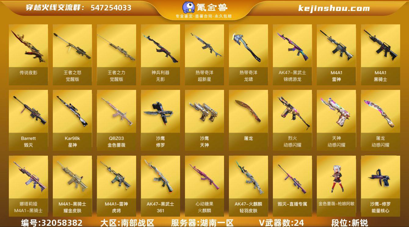 【ky5385】湖南一区-23V-2王者武器数-0炫金武器数 【传说武器】:传说夜影 【热门武器】:传说夜影,QBZ03-金色蔷薇,Kar98K-星神,金色小号,Cat-刀锋,M4A1-黑骑士,沙鹰-修罗*4,金刚伞 【音效卡】:M4A1-黑骑士音效卡,Barrett-毁灭音效卡,枪娘语音包-阿敏 【皮肤】:金色蔷薇-枪娘阿敏 皮肤,雷神-虎将,火麒麟-轻羽皮肤,火麒麟-心动糖果,毁灭-直播专属,毁灭-英雄计划 皮肤,黑骑士耀金皮肤,M4A1-黑骑士-娜塔莉娅 皮肤,黑骑士-破界 皮肤,AK47-黑武士-361,修罗-能量核心 【角色】:奇洋探员,乔伊教练,暗夜-X,电竞少女,飞虎队-X,风暴女,虎妞,嘉年华灵狐,娟娟,0号玩家,龙儿,麻雀,萌儿,女主播,潘多拉-X,蛇姬,斯沃特-X,铁骑荣耀,新娜塔莎,雪莉杨,游珑儿 【人偶武器】:AWM-灵狐-15周年嘉年华,Cat-刀锋,迷你深渊冰龙,生化手雷-机甲核心,灵狐娃娃手雷 【暴走生化】:超级对讲机 【挑战大师】:激光毁灭者III-白马银枪,激光毁灭者III,神圣爆裂者-末日III 【英雄级武器】:M4A1-雷神,M4A1-黑骑士,QBZ03-天罚,无影-神兵利器,黑武士-锦绣游龙,超新星-热带奇洋,QBZ03-金色蔷薇,烈火-动感闪耀,Barrett-毁灭,Kar98K-星神,王者之怒-觉醒版...