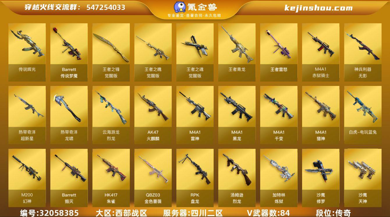 【ky5655】四川二区-91V-11王者武器数-0炫金武器数 【传说武器】:传说辉光,传说梦魇 【热门武器】:传说梦魇,传说辉光,QBZ03-金色蔷薇,HK417-朱雀,M200-幻神,白虎-电玩蓝兔,汤姆逊-烈龙*6,RPK-盘龙*6,加特林-炼狱,斯泰尔-蝴蝶,沙鹰-修罗*2 【王者炫金武器】:王者青龙,王者雷怒,王者之魄高爆手雷*3,王者之魄闪光弹*3 【音效卡】:M200-幻神音效卡,AK47-火麒麟音效卡,M4A1-雷神音效卡,Barrett-毁灭音效卡,QBZ03-金色蔷薇音效卡,枪娘语音包-阿敏,加特林-炼狱音效卡 【皮肤】:幻神-电流骇客 皮肤,白虎-茸茸松狮,雷神-荣耀之魄,雷神-宇航兔皮肤,雷神-源计划2.0专属 皮肤,火麒麟-轻羽皮肤,火麒麟-心动糖果,毁灭-风暴,毁灭-虹光风暴 皮肤,毁灭-英雄计划 皮肤,M4A1-千变-孔明皮肤,AK47-B-常胜将军-孙权*2,炼狱-玩具枪皮肤,天神-春花弄影 皮肤,屠龙-春桃 皮肤 【角色】:雨棠,关小雨,枪娘樱,兰-巾帼英雄,晴雅,机械姬,王者-瞳-闭月羞花,王者玲珑,王者-魅影,王者炽天使,奇洋探员,乔伊教练,修道士,云海玲珑,初恋灵狐,芳心审判者,虎妞,嘉年华灵狐,兰-新年限定,灵动武士,灵狐-花神,灵狐者-七夕宝贝,龙儿-小淘气,曼陀罗-礼服,萌儿,潘多拉-X,潜龙队-X,青霞仙子,斯沃特-X,兔囡囡,雪莉杨,智影 【人偶武器】:天龙-曼陀罗,斯泰尔-蝴蝶,巴雷特-零-水下丽影,跳跳鲨,AWM-灵狐-15周年嘉年华*2,COP-旗袍,迷你生化手雷,生化手雷-机甲核心,Barrett-夜玫瑰,迷你超能女侍 【暴走生化】:KAC-狂怒咆哮,双面神,超级对讲机 【挑战大师】:冰龙粉碎者-白马银枪 【英雄级武器】:M4A1-千变,AK47-火麒麟*2,M4A1-黑龙,M4A1-雷神,HK417-朱雀,M4A1-神工天巧,无影-神兵利器,超新星-热带奇洋,QBZ03-金色蔷薇,M4A1-猎神,烈火-动感闪耀,王者之魄-觉醒版,AK-47-...