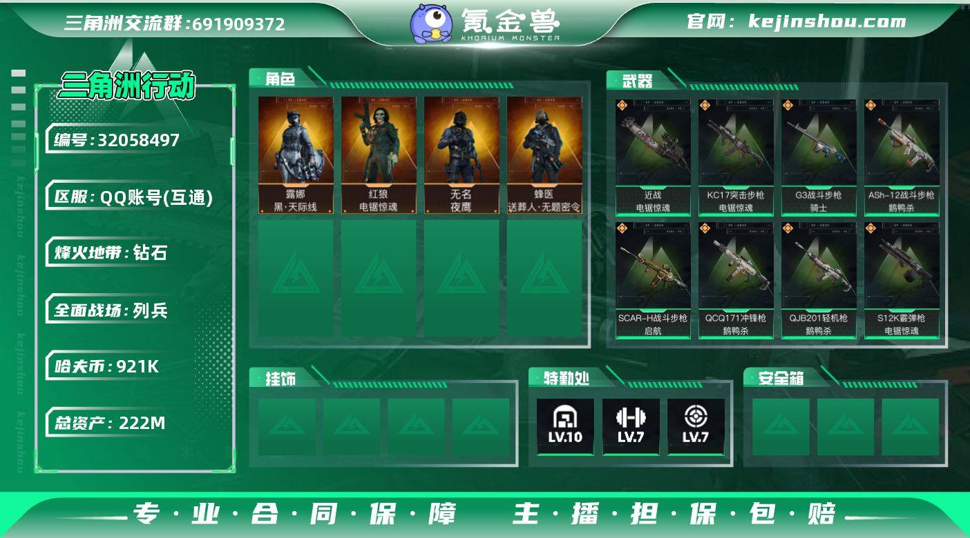 222m总资产-921k哈伏币-60烽火等级-钻石-26战场等级-列兵 【干员外观】:露娜-黑·天际线,蜂医-送葬人·无题密令,无名-夜鹰,红狼-电锯惊魂 【近战皮肤】:近战-电锯惊魂,近战-黑鹰 【传说外观】:M4A1突击步枪-阿米娅,ASh-12战斗步枪-鹅鸭杀,M16A4突击步枪-狩猎时刻,AK-12突击步枪-夜鹰,AK-12突击步枪-特斯拉线圈,SCAR-H战斗步枪-启航,G3战斗步枪-狩猎时刻,G3战斗步枪-骑士,CAR-15突击步枪-阿米娅,KC17突击步枪-电锯惊魂,Vector冲锋枪-狩猎时刻,UZI冲锋枪-特斯拉线圈,SR-3M紧凑突击步枪-特斯拉线圈,勇士冲锋枪-能天使-午夜邮差,QCQ171冲锋枪-鹅鸭杀,S12K霰弹枪-电锯惊魂,725双管霰弹枪-送葬人-无题密令,QJB201轻机枪-鹅鸭杀,M14射手步枪-电锯惊魂,复合弓-黑·天际线 【史诗外观】:AKM突击步枪-林中猎手,ASh-12战斗步枪-守夜人,M16A4突击步枪-竞赛选手,AUG突击步枪-蝮蛇,SG552突击步枪-尖端治疗,SG552突击步枪-深海恐惧,SCAR-H战斗步枪-囚徒,AS Val突击步枪-尖端治疗,AS Val突击步枪-典狱官,腾龙突击步枪-无垢,腾龙突击步枪-猎鳄行动,MP5冲锋枪-战术竞备,MP5冲锋枪-竞技风,P90冲锋枪-莫斯提马,SR-3M紧凑突击步枪-荒野求生,SR-3M紧凑突击步枪-战术竞备,勇士冲锋枪-工业狂潮,MP7冲锋枪-无垢,M1014霰弹枪-林中猎手,PKM通用机枪-蝮蛇,PKM通用机枪-守夜人,PKM通用机枪-荒野求生,M250通用机枪-囚徒,SVD狙击步枪-暗夜猎手,SVD狙击步枪-荒野求生,SR-25射手步枪-尖端治疗,PSG-1射手步枪-无垢,SV-98狙击步枪-林中猎手,SV-98狙击步枪-囚徒,SV-98狙击步枪-猎鳄行动,M700狙击步枪-蝮蛇,M700狙击步枪-守夜人,.357左轮-幸运时刻,沙漠之鹰-曙光 【稀有外观】:AKM突击步枪-青纹,M700狙击步枪-极地勘察队,AKM突击步枪-前沿科技,AKM突击步枪-肃杀,QBZ95-1突击步枪-公平竞...